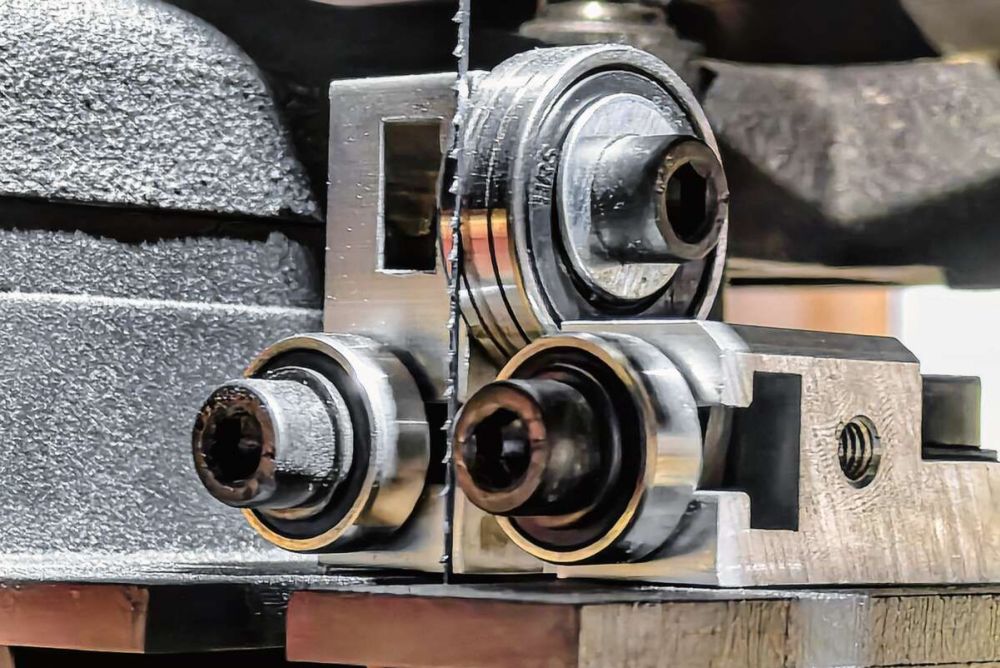 Nachdem die Bandsäge ihre Eignung bewiesen hat, geht es an das, was diese Maschine besonders macht: Man kann sie mit ein paar Handgriffen in eine Dekupierbandsäge, verwandeln. Manche sagen dazu auch Laubsäge oder Feinschnittsäge. Dazu lege ich zunächst den Riemen für eine Verdoppelung der Bandgeschwindigkeit um. Das Band ist schnell entspannt und gewechselt. Ich entscheide mich gleich für das kleine 9er-Band, dass nur 2 mm breit und damit für enge Radien geeignet ist. Im Lieferumfang ist auch das etwas breitere 12er-Band enthalten. An der oberen Rolle kommt das Band in eine Nut des Rades, unten hält man es mit einer Hand etwa mittig auf der Rolle, während die andere Hand oben am Gehäuse das Band spannt. Zuvor jedoch muss noch etwas umgerüstet werden. Die obere Bandführung muss gedreht und die hintere Rolle getauscht werden. Die bebilderte Beschreibung zum Prozedere scheint mir etwas kompliziert, denn jede der beiden Lager hat zwei Nuten. Anders als üblich sind die Rollen hinter dem Sägeblatt in der oberen und unteren Führung um 90° gedreht. Beim Dekupierbandschnitt läuft das Sägeband in der Nut, sodass sich die Rolle dreht und das Band seine Stabilität erhält. An der unteren Führung wird ebenfalls eine genutete Rolle montiert. Oben läuft das Band in der rechten Nut, unten links ist die Seite der 9er-Bandnut mit einem gelben Punkt markiert. Genau: etwas kompliziert beim ersten Mal, aber wenn man weiss, wie es geht, ist es ganz einfach, denke ich mir, auch wenn ich jeden Satz gefühlt fünfmal gelesen habe, bevor ich mir sicher war, dass das Band unten wie oben in der richtigen Nut läuft und auch alle anderen Details stimmen. Schliesslich ist es ungewöhnlich, dass bei einer Bandsäge die paarweisen seitlichen Bandführungsrollen einfach keine Rolle spielen. Sie werden zurückgestellt, sodass sie nicht das Sägeblatt berühren können. Das Dekupierband-Sägeblatt wird nur durch die drei Nuten auf Kurs gehalten: die beiden Führungslager sowie die obere Umlenkrolle des Bandes mit Nut. Damit das Band stabil mittig in der Nut der Laufrolle dreht, muss man einige Male die Neigung der Rolle korrigieren. Sobald es dann stimmt, läuft das Band aber beim Sägen stabil. Etwas unverständlich ist mir, warum die Rollenlager mit den Nuten einen Innendurchmesser von 9 mm haben, wo sie doch mit einer M6-Schraube befestigt werden. Durch die 3 mm Spiel wird das exakte zentrische Fixieren der beiden Rollen leider erschwert. Wegen des Spiels wird der Tausch etwas zur Geduldsprobe, zumal es an den Stellen ja auch eng zugeht. Laut Bedienungsanleitung sollen sich die Rollenlager beim Sägen drehen, damit sich die Bänder nicht an einer Stelle ins Lager schleifen. Es muss also exakt eingestellt werden.