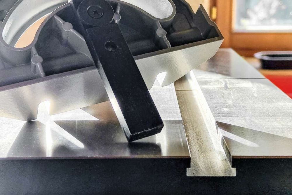 Dabei stört, dass der Winkelanschlag Spiel in der T-Nut für die Führung aufweist, was das ganze Prozedere nicht gerade erleichtert. Der Winkelanschlag wird mit einem Vierkantstab in der Nut geführt und nicht mit einem passenden T-Profil. Auch die Markierung ist praktisch nicht genau abzulesen, weshalb ich mich entscheide, in Sachen Winkelanschlag bald nach einer besseren Lösung zu suchen. Der Parallelanschlag ist schnell ausgerichtet. Da der Tisch nun stimmt, lässt sich dieser entlang der Tischnut exakt einstellen. Die Klemmung des Anschlages über den Exzenterhebel ist gut, das Anschlaglineal stabil. Man sollte den Anschlag allerdings beim Klemmen leicht zurückziehen, sodass dieser an der Schiene anliegt. So lässt sich der Anschlag ohne Ungenauigkeiten fixieren. Wenn man nicht darauf achtet, verdreht es den Anschlag beim Fixieren leicht, und das Mass stimmt unter Umständen nicht mehr ganz genau.