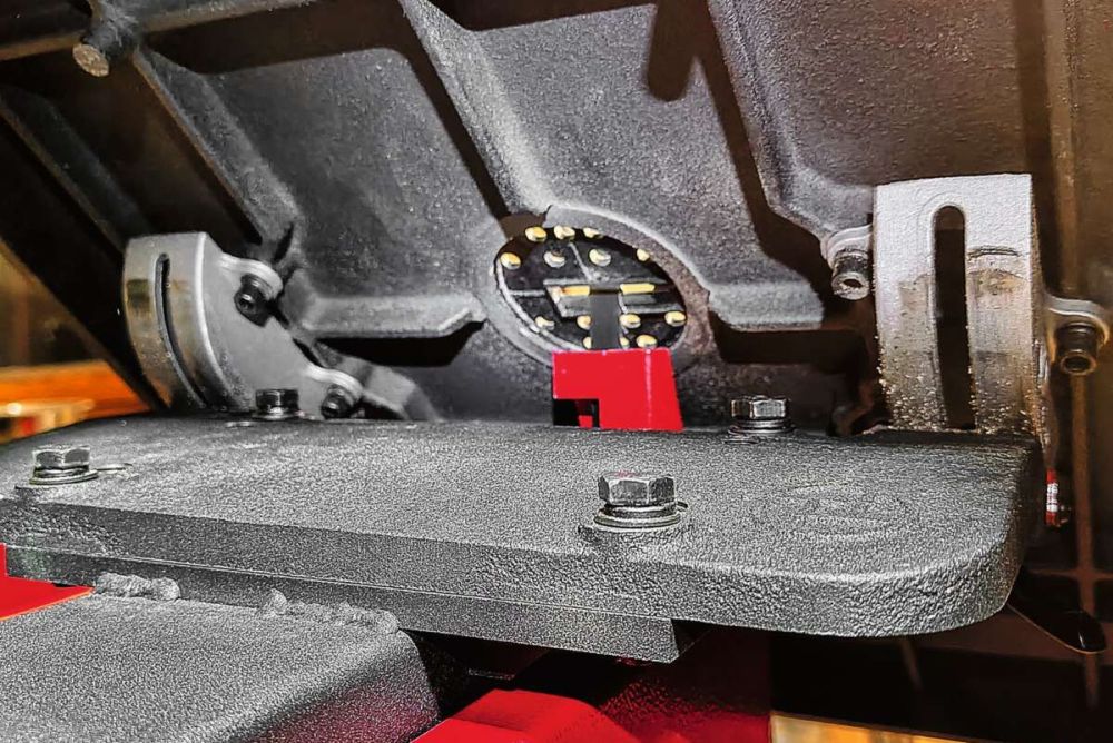 Es zeigt sich, dass zwar die Säge schnell auf dem Gestell platziert ist, es aber doch einiges an Zeit, Mühe und Geduld braucht, bis alles eingestellt ist. Der Maschinentisch aus Stahlguss weist ein vertrauenerweckendes Gewicht auf. Als eines der wenigen Teile muss dieser montiert werden. Sein Flansch wird mit vier M8-Maschinenschrauben am Sägen-chassis befestigt. Ich will erst mal mit dem normalen Bandsägeblatt anfangen. Das ist werkseitig schon aufgelegt. Die Führungen sind schnell justiert und das Band sauber auf den Rollen gespannt. Als Orientierung für die Blattspannung dient eine Skala an der Rückseite des Gehäuses der oberen Rolle. Das hilft, auch wenn sie etwas Spiel hat und deshalb nicht exakt sein kann. Auch tauchen bei der Bandlänge aus verschiedenen Quellen 2300 mm und 2305 mm auf.