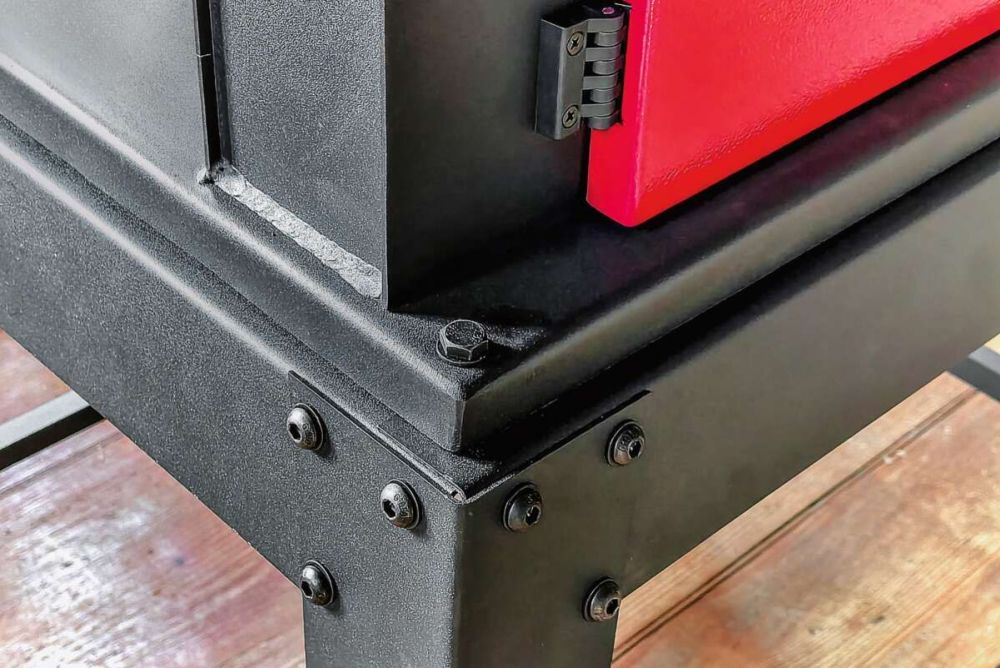 Die Säge kommt im doppelten Karton und mit Styropor-Formteilen verpackt. Alles raus und sortieren, dann geht es los. Zuerst ist das Untergestell dran. Ich schraube es zusammen und denke: schon mal gut! Die Winkelbleche mit ansehnlichen 2 mm Materialstärke sorgen für eine ausgesteifte Konstruktion, und die Gummifüsse sichern das Ganze gegen ein Verrutschen beim Sägen, wie sich zeigen wird.