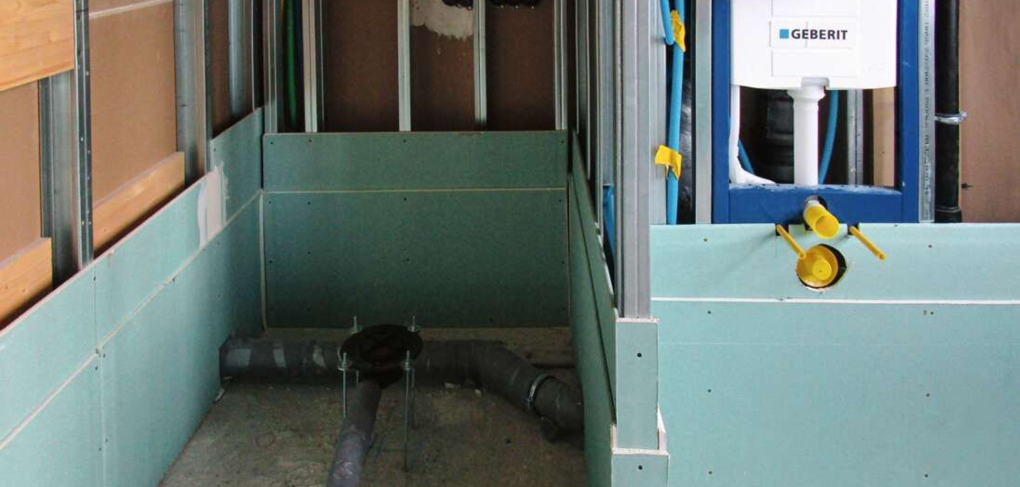 Schreiner arbeiten vor allem mit Massivholz-Unterkonstruktionen. Gipser verwenden Leichtbausysteme mit u-förmigen Blechprofilen, die dort verstärkt werden müssen, wo durch Anbauteile, wie Waschbecken, eine höhere Belastung verursacht wird. Eine undichte Stelle kann beim Blech zu Korrosion und beim Holz zu Fäulnis sowie Pilzbefall führen – was auf gar keinen Fall geschehen darf.