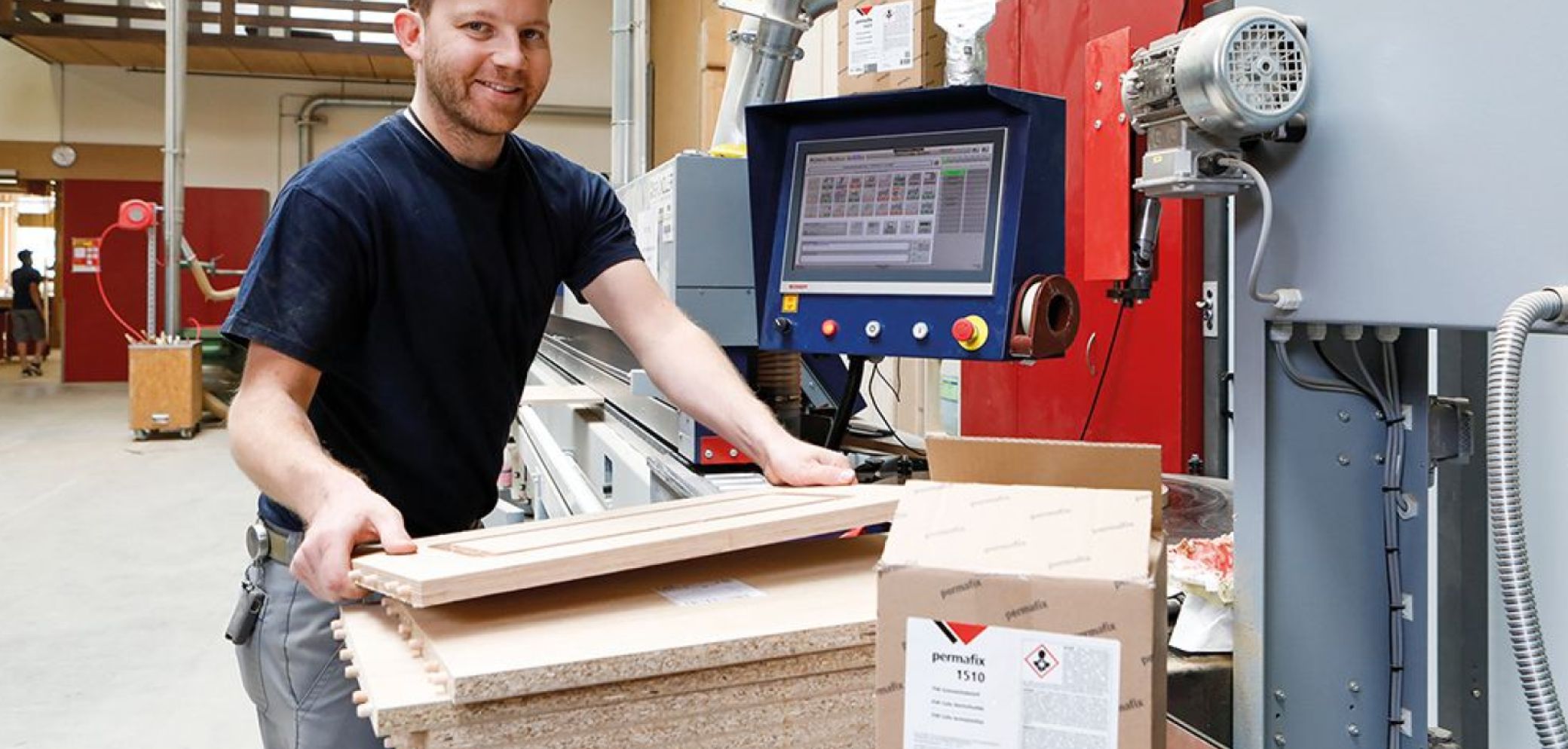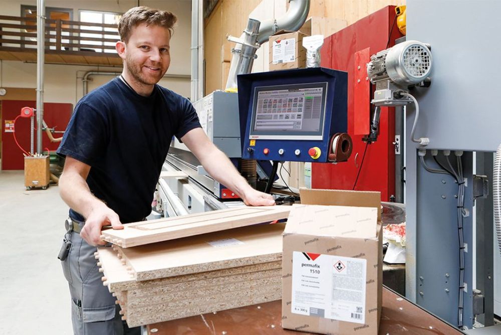 Alain Werren, Werkstattleiter bei der Zbären Kreativküchen AG, verarbeitet Kantenklebstoffe von Permafix. Bild: Permapack AG