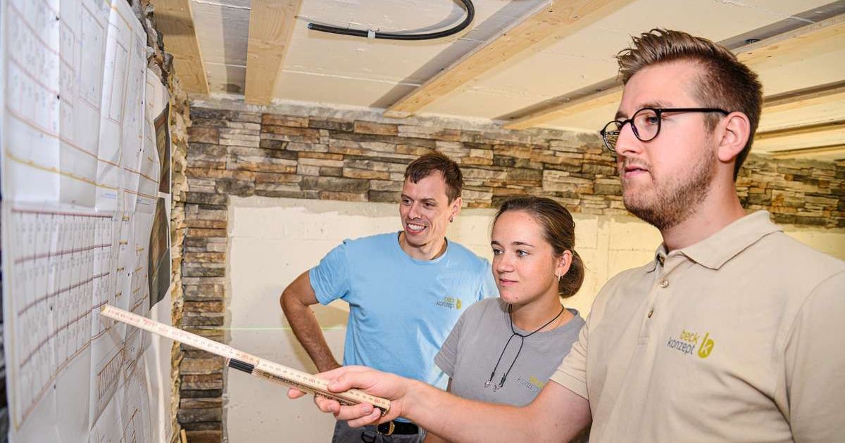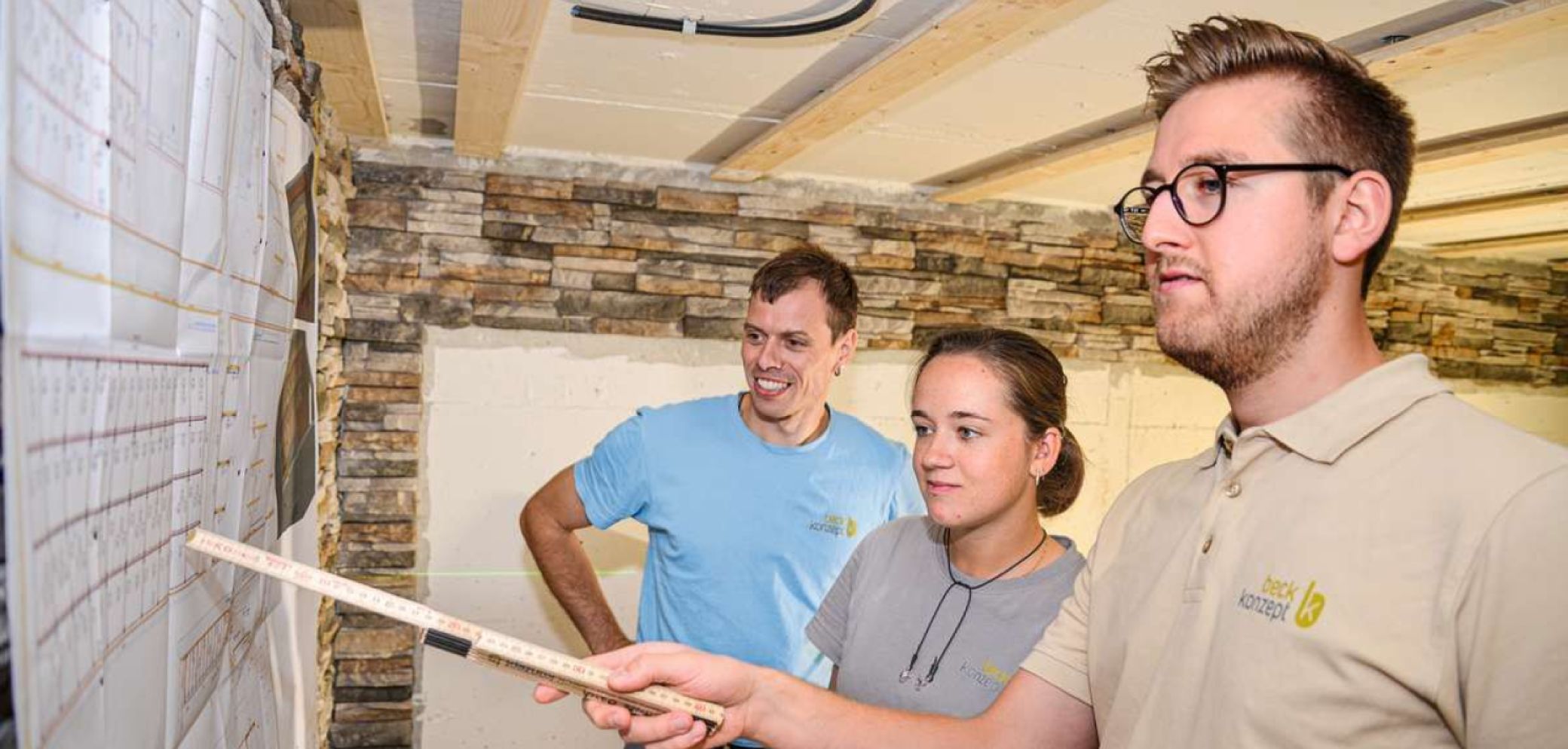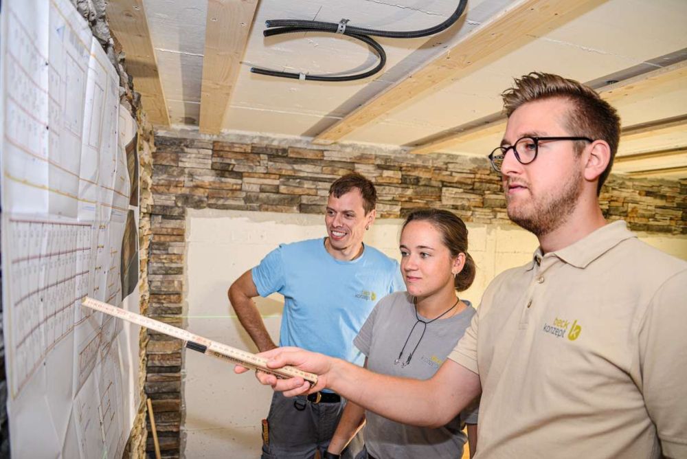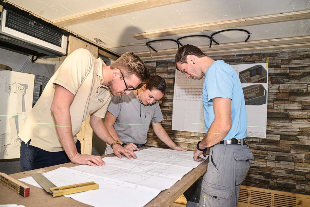 Schlüsselfunktion im Betrieb: Sandro Scherrer (r.), Techniker HF bei der Beck Konzept AG, zusammen mit der Lernenden Noëlle Bösch und Monteur Armin Küng. Bild: Sascha Frey (HF Bürgenstock)