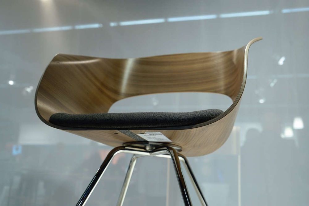 Furnieranbieter zeigten ebenso ornamentartig zusammengesetzte Blätter, die Ähnliches in flacher Form erlauben. Mit Furnier wird aber auch Sperrholz hergestellt und das lässt sich noch ganz anders in Form bringen. Die Hess & Co. AG aus dem aargauischen Döttingen zeigte unter anderem den Schlitten eines jungen Unternehmens mit interessanten Elementen aus Formsperrholz.