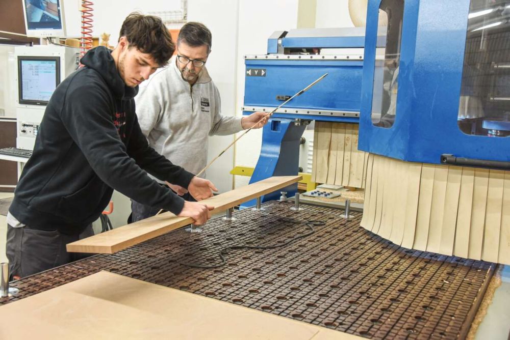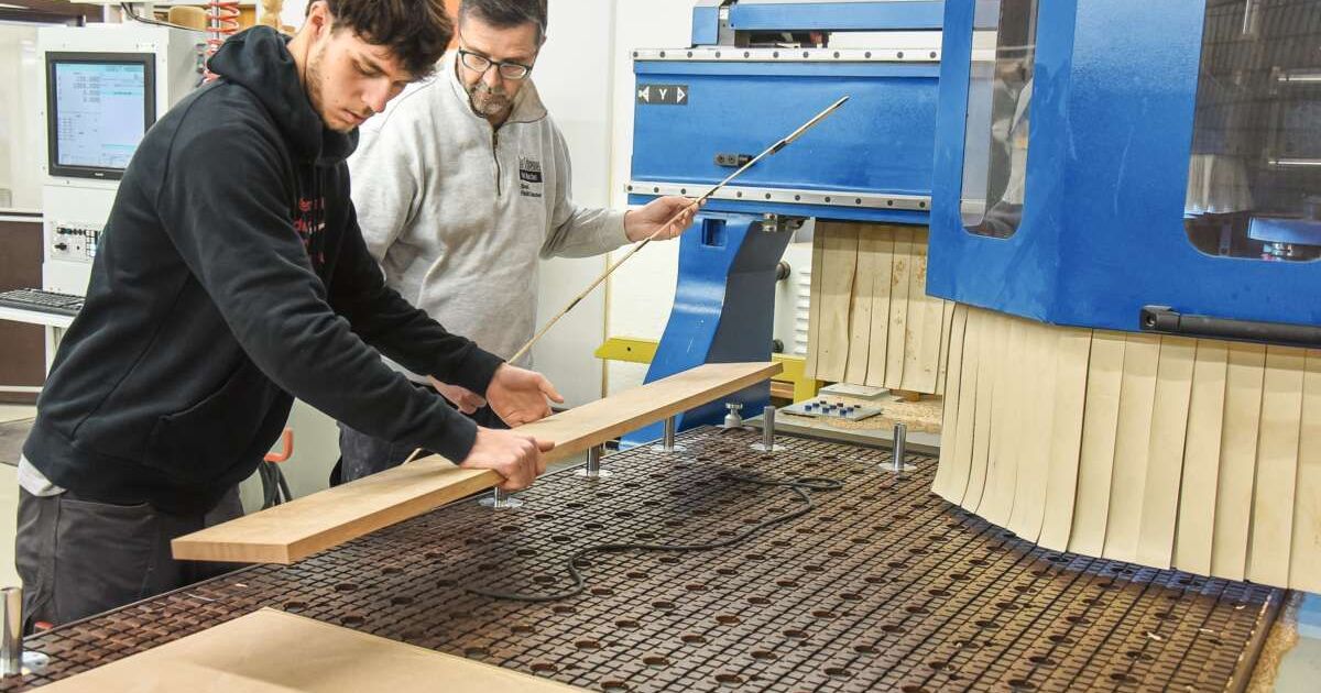 Schreinerfachlehrer Hans-Peter Gerber hilft dem Lernenden Janis Reinhard, das CNC-Bearbeitungszentrum zu beschicken. Bild: PD