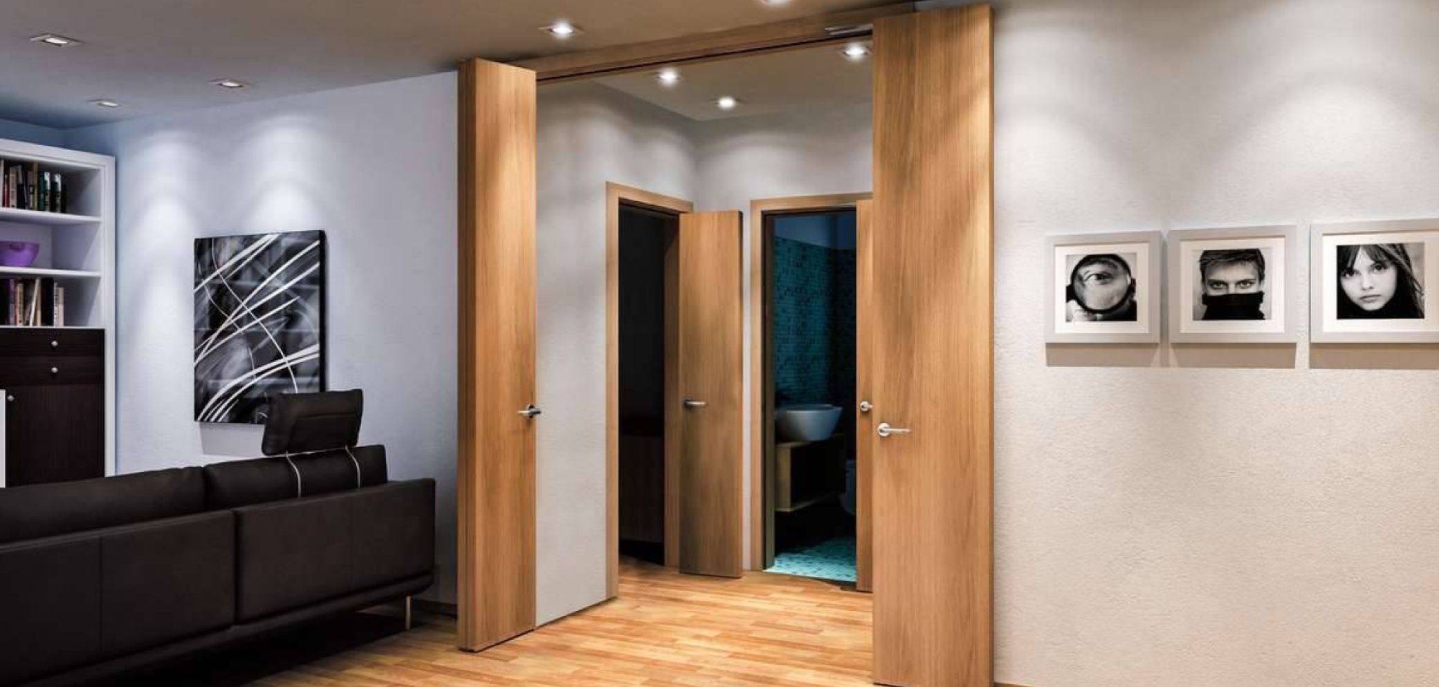 Das Klapptürsystem «Compack 180°» von Ackutech erlaubt eine wirklich sehr platzsparende Türlösung. Das längs geteilte Türblatt erhält über die Trennfuge an der unteren Stirnkante ein Scharnier und wird zum Rahmen hin mit einem Zapfenband verbunden. Auf der oberen Stirnkante des Türblatts und zum Rahmensturz hin verbindet eine Parallelogrammführung aus Flachstahl Blatt und Türrahmen. Diese bewirkt bei der Öffnungsbewegung, dass die Blatthälften zusammenklappen und das gesamte Rahmenlichtmass als Durchgang zur Verfügung steht. Im geschlossenen Zustand ist das Türblatt dann steif und somit abschliessbar. Zudem gibt es auch Lösungen mit asymmetrisch geteilten Blättern, wodurch die Position der Drücker variiert werden kann.