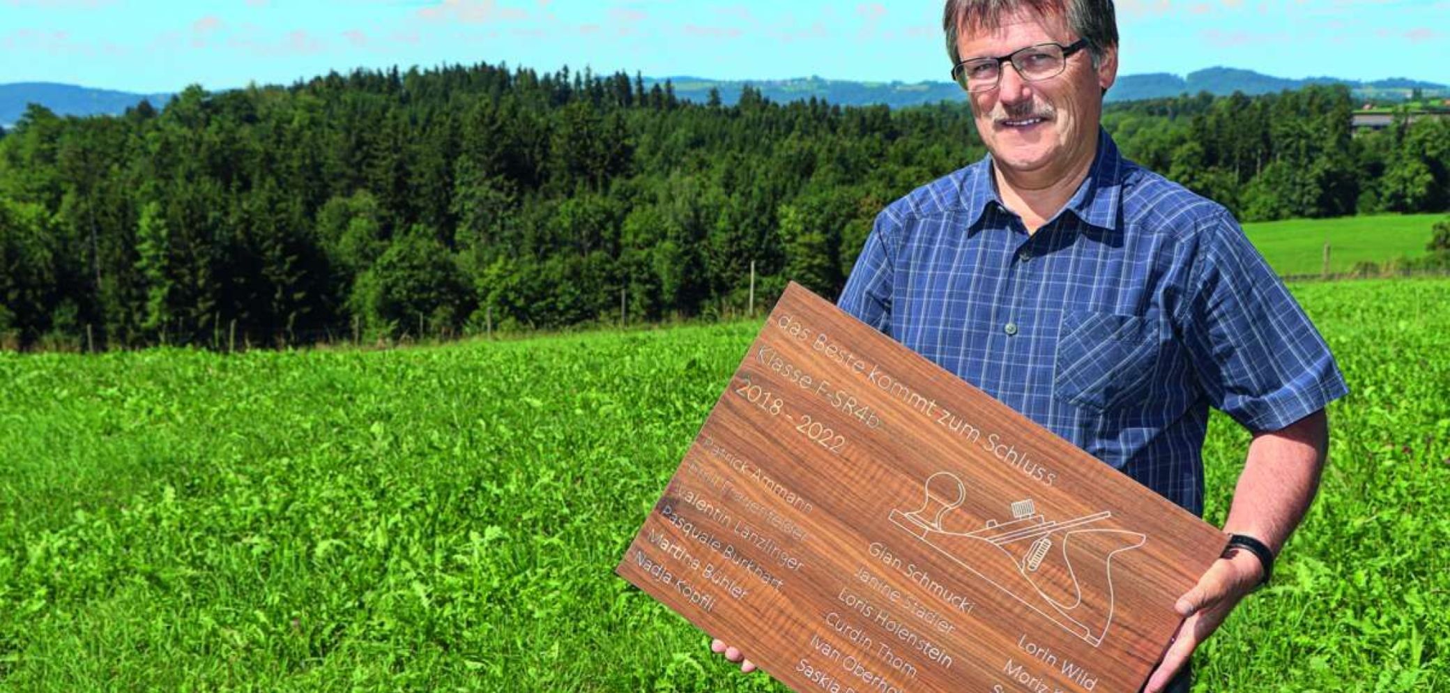 Die letzte Klasse schenkte Linus Calzaferri eine Erinnerungstafel. Nun kann er wieder mehr Zeit in der Natur verbringen. Bild: Ralph Dietsche