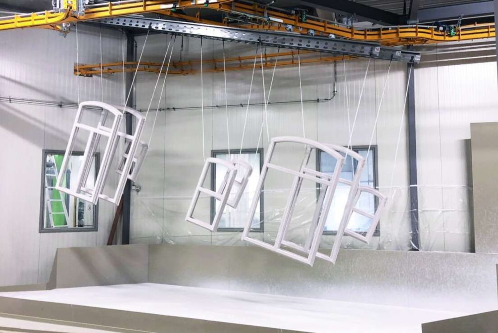 Unterstützt mit modernster Computer- und Robotertechnologie, erhalten die Fenster und Türen Oberflächen höchster Güte, die in mehreren Schritten entstehen. Dazu werden die Elemente zunächst an Traversen gehängt. Über die Fördertechnik, die für sich ein Gewicht von über 25 Tonnen auf die Waage bringt, gelangen die Elemente zu den einzelnen Stationen der Anlage.