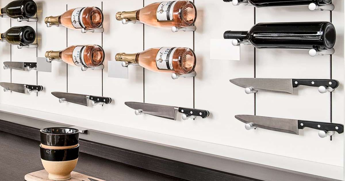 Beim Wandkonsolensystem «Pin» von Salice werden Rahmenprofile von hinten vertikal in Holzpaneele eingefräst. In die von vorne noch vier Millimeter breiten, sichtbaren Nuten lassen sich Aluminium-konsolen einsetzen und stufenlos in der Höhe positionieren. Dank Ankerschrauben und eines mehrteiligen Systems von Trag-, Schraub- und Beschriftungselementen lassen sich unterschiedliche Halterungen zusammenbauen. Auf diese Weise kann eine Paneelenwand Tablare tragen und einzelne oder paarweise Flaschen hori-zontal halten. Selbst das Aufhängen von Messern in horizontaler Lage lässt sich bewerkstelligen, was das System für Nischenwände in der Küche noch interes-santer macht. Die Rahmenprofile haben eine maximale Länge von 3000 mm bei einer Breite von 23 mm und einer Stärke von 10,5 mm. Sie können freistehend direkt an die Wand montiert oder in ein Holzpaneel eingelassen werden. Erhält-lich sind die Oberflächen als Aluminium oder als sehr dunkles Titanium.