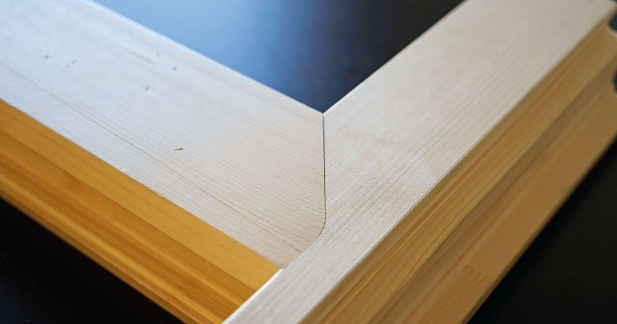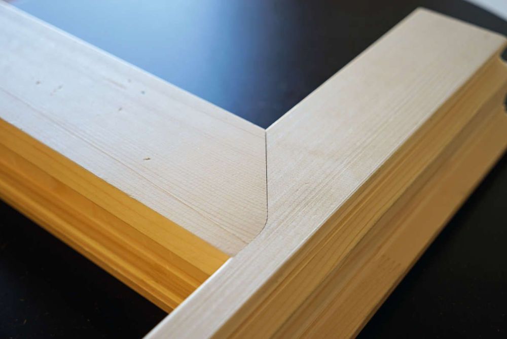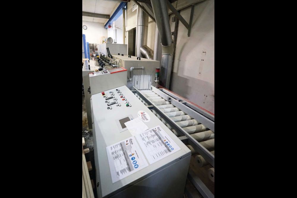 Auch der Schleifautomat «Q-Fin» von Martin stellt sich automatisch auf das jeweilige Profil ein. Die im Durchlauf rundum fertig geschliffenen Friese fahren direkt im Anschluss in eine 2,3 m kurze Flutungsanlage von Finiture. Diese entstaubt, beschichtet und bläst das überflüssige Material gleich wieder ab. Nach dem gut doppelt so langen Trockenkanal gelangen die Teile zur Rahmenpresse. Damit ist die Schreinerei Theo Graf die einzige der drei Firmen, deren Rahmenelemente schon vor dem Verleimen grundiert sind. Alles Folgende spielt sich anschliessend produktionstechnisch im gut organisierten, konventionellen Rahmen ab.