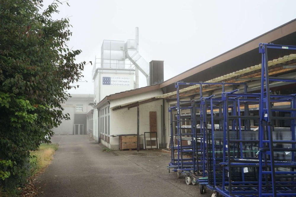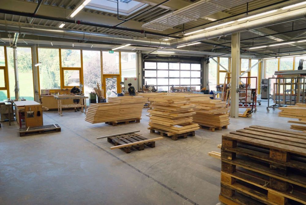 Der letzte Anbau ist vom Dorf abgewandt und wirkt wie ein hochmoderner Bürokomplex mit seiner grosszügigen Glasfassade. In Wahrheit liegen dahinter aber die grossen und hellen Produktionsräume. Bei der Fassade handelt es sich um das hauseigene Modell «Future Windows», dessen Stufenglas den Holzrahmen von aussen verdeckt. Somit kann aussen ausschliesslich Glas gezeigt werden, und innen ist es immer noch ein normales Holzfenster mit allen sonst auch üblichen Funktionen. Neben diesem speziellen Fenstertyp sind die verschiedensten Holz- und Holz-Metall-Fenster-Modelle im Angebot sowie Hebeschiebetüren. Diese brauchen mit ihren Dimensionen gesonderte Aufmerksamkeit und eigene Produktionsbereiche.