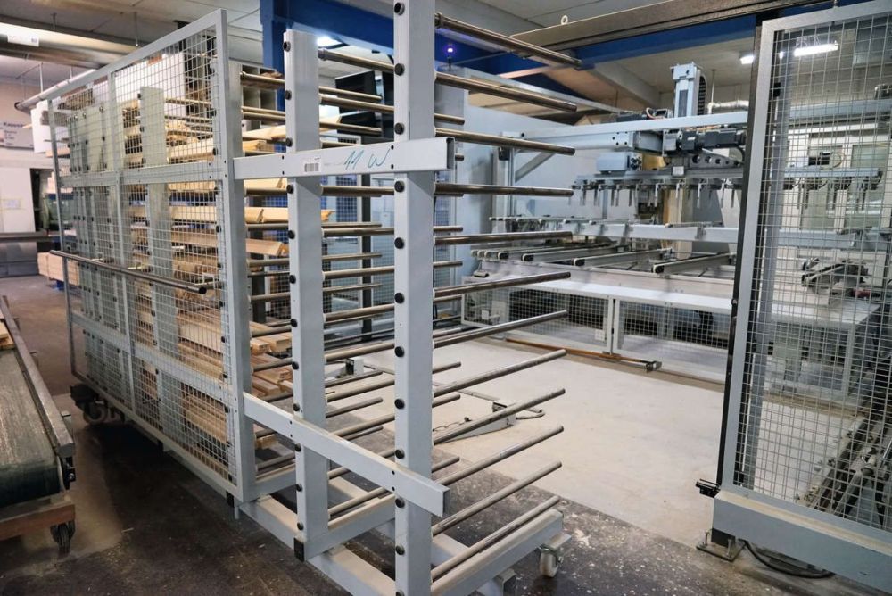 Automation heisst vor allem erst mal absolute Planung. Jedes Modell ist vollumfänglich digital und massvariabel definiert, damit sämtliche Anlagen über den Strichcode gesteuert werden können, was die Einstellzeiten praktisch eliminiert. Der Code der abgelängten Kanthölzer steuert somit zuerst den Vierseiter. Nach Vorgabe der Avor wird dann der Regalwagen für das CNC-Bearbeitungszentrum (Baz) geladen, und sobald dieser angedockt ist, übernimmt die Maschine den gesamten Bearbeitungsprozess. In umgekehrter Reihenfolge liegen dann die fertigen Teile wieder im ursprünglichen Regalfach. Einzig Rundbögen müssen noch von Hand auf einen Spezialschlitten des Baz von Homag aufgelegt werden.