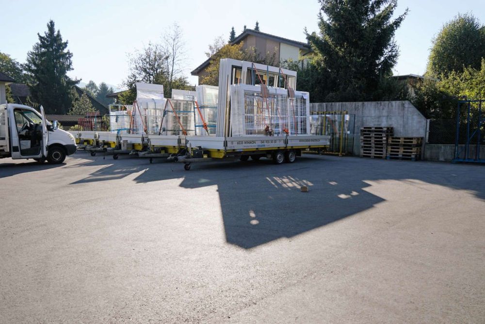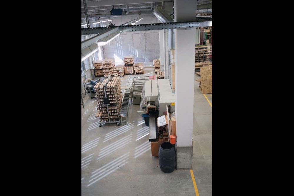 Die neuen Räume schaffen viel Platz für die weitere Bearbeitung an Verleimstationen und im Verputzbereich. Für die Oberfläche und die Beschlägemontage muss dann allerdings das Stockwerk gewechselt werden. Dafür kann so mit den gleichen grosszügigen Platzverhältnissen gearbeitet werden. Der Einsatz von Schraubrobotern sorgt bei der Beschlägemontage für eine hohe Effizienz. Interessant ist auch die Lieferung zum Kunden: Die Montageteams nehmen ihren Tagesbedarf an Fenstern gleich auf einem Anhänger mit. So entfällt der zusätzliche Aufwand mit einem Transporteur, und auf der Baustelle muss kein Zwischenlager eingerichtet werden.