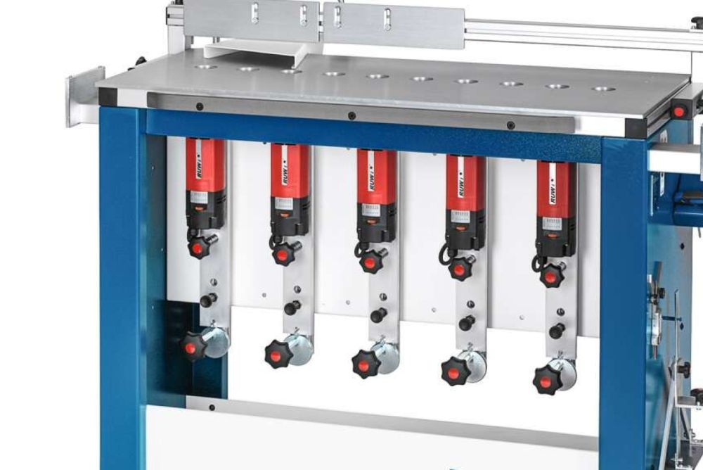 Seit über 20 Jahren fertigt die Firma Ruwi Fräs-, Hub- und Bohrtische für Schreinereien und die Holzindustrie. Das Unternehmen aus dem Schwarzwald ist vor allem bekannt für seine konfigurierbaren Frästische. Bei einer Tischoberfräse verrichtet normalerweise ein einzelner Motor seinen Dienst. Der Ruwi-Frästisch kann in der Premium-Version jedoch mit bis zu zehn Motoren bestückt werden. So kann wertvolle Rüstzeit eingespart werden, indem verschiedene Fräser eingespannt bleiben. Sprichwörtlich im Handumdrehen werden die Werkzeuge in Position gebracht. Über einen Exzentergriff wird das Fräsaggregat in der Höhe verstellt. Dabei kann für jede Einheit einzeln eine fixe Endposition definiert werden. So lassen sich beispielsweise Rundungen und Fasen wiederholt gleich bearbeiten. Fräser und Werkzeug finden Platz in einer Ablage unter der hochklappbaren Arbeitsfläche.