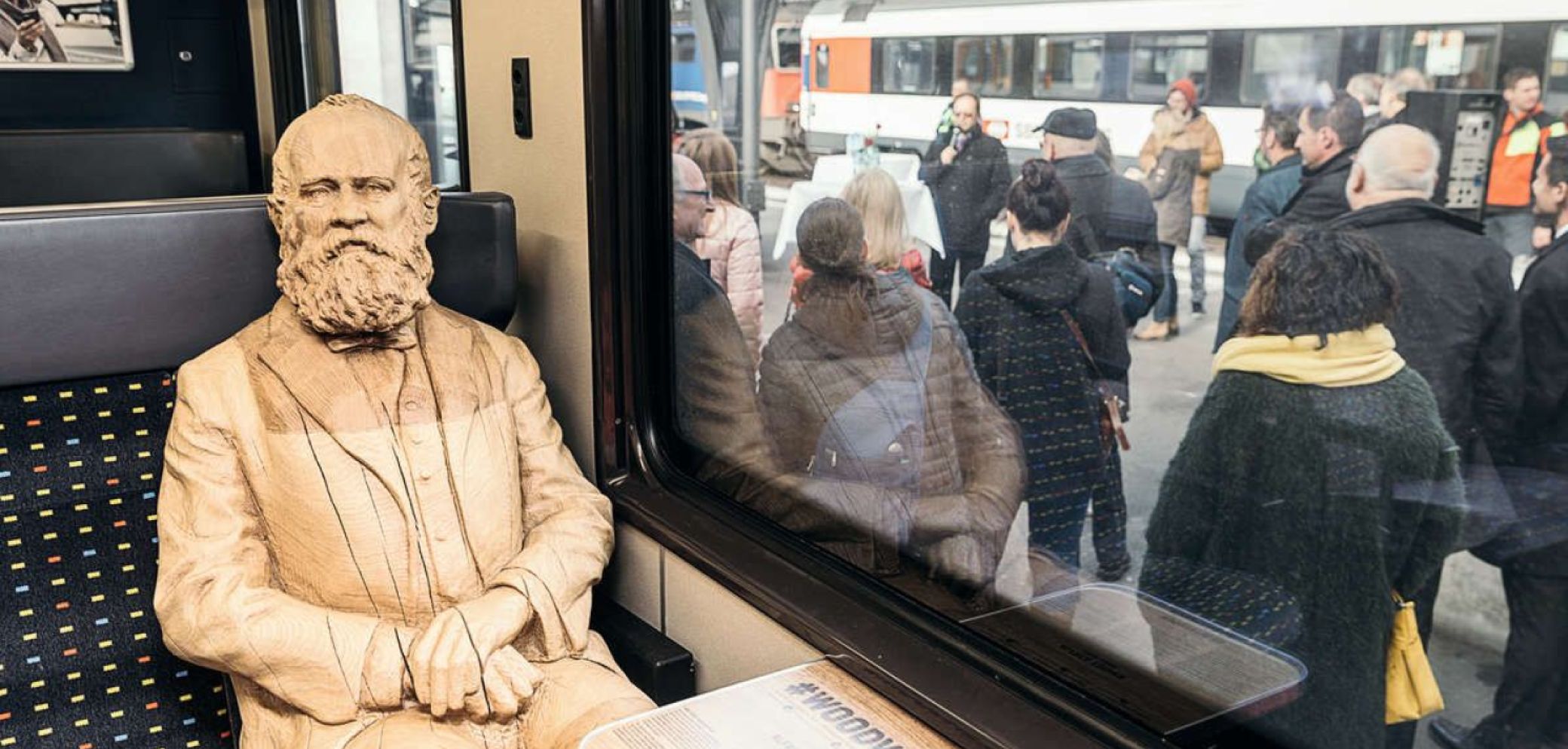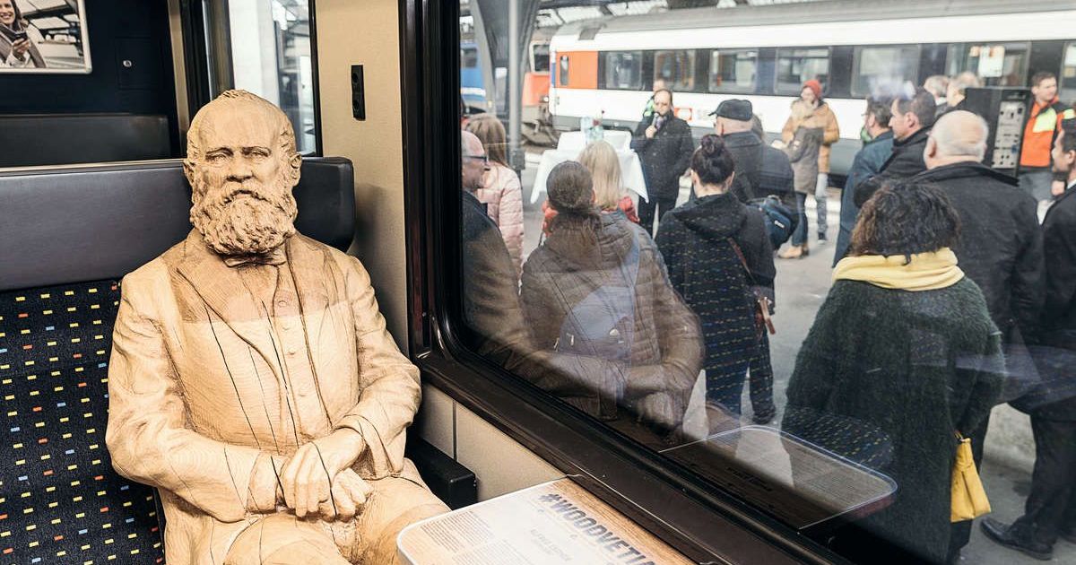 Woodvetia. Manch ein Zugpassagier wird in den nächsten Monaten seinen prominenten Sitznachbarn bewundern. Im Rahmen der Schweizer Holz-Förderungskampagne Woodvetia fährt nämlich der Pionier Alfred Escher – aus Eiche gefertigt – im SBB-IC durch die Schweiz.