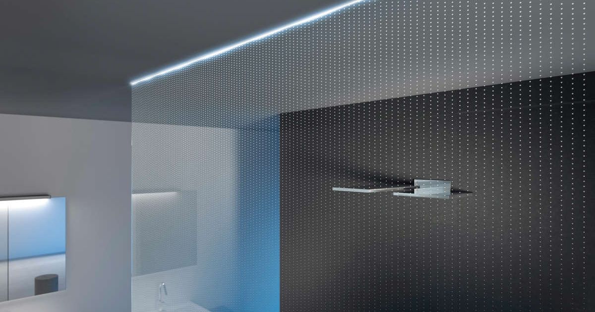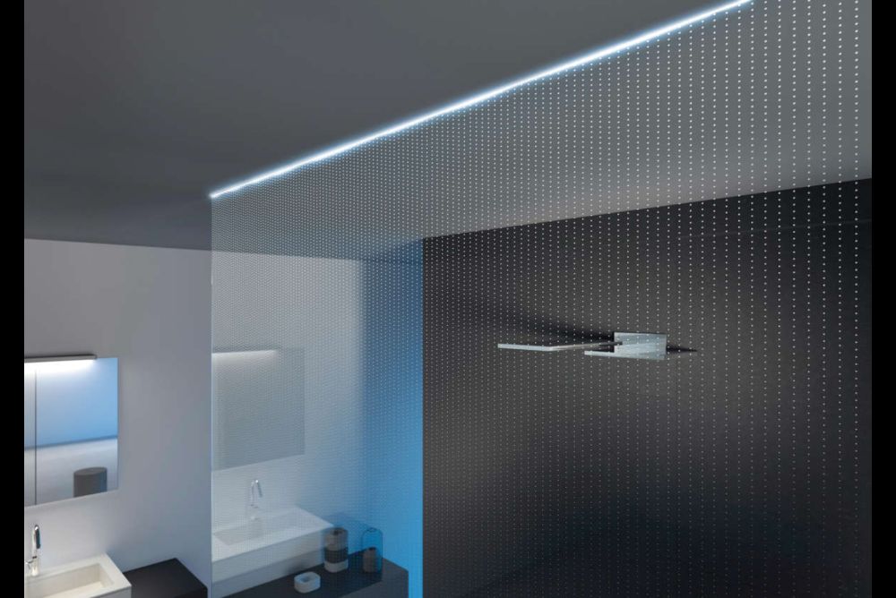 Der Lichteffekt der neuesten «Transparenti Madras» aus extraklarem Glas von Vitrealspecchi zeigt sich bei «Punto-NL» und «Punto-N Cristalli» in kleinen glänzenden Punkten auf der Oberfläche. Werden LEDs an den Glaskanten positioniert, erleuchten diese die Punkte und verwandeln die Oberfläche in eine Lichttextur.