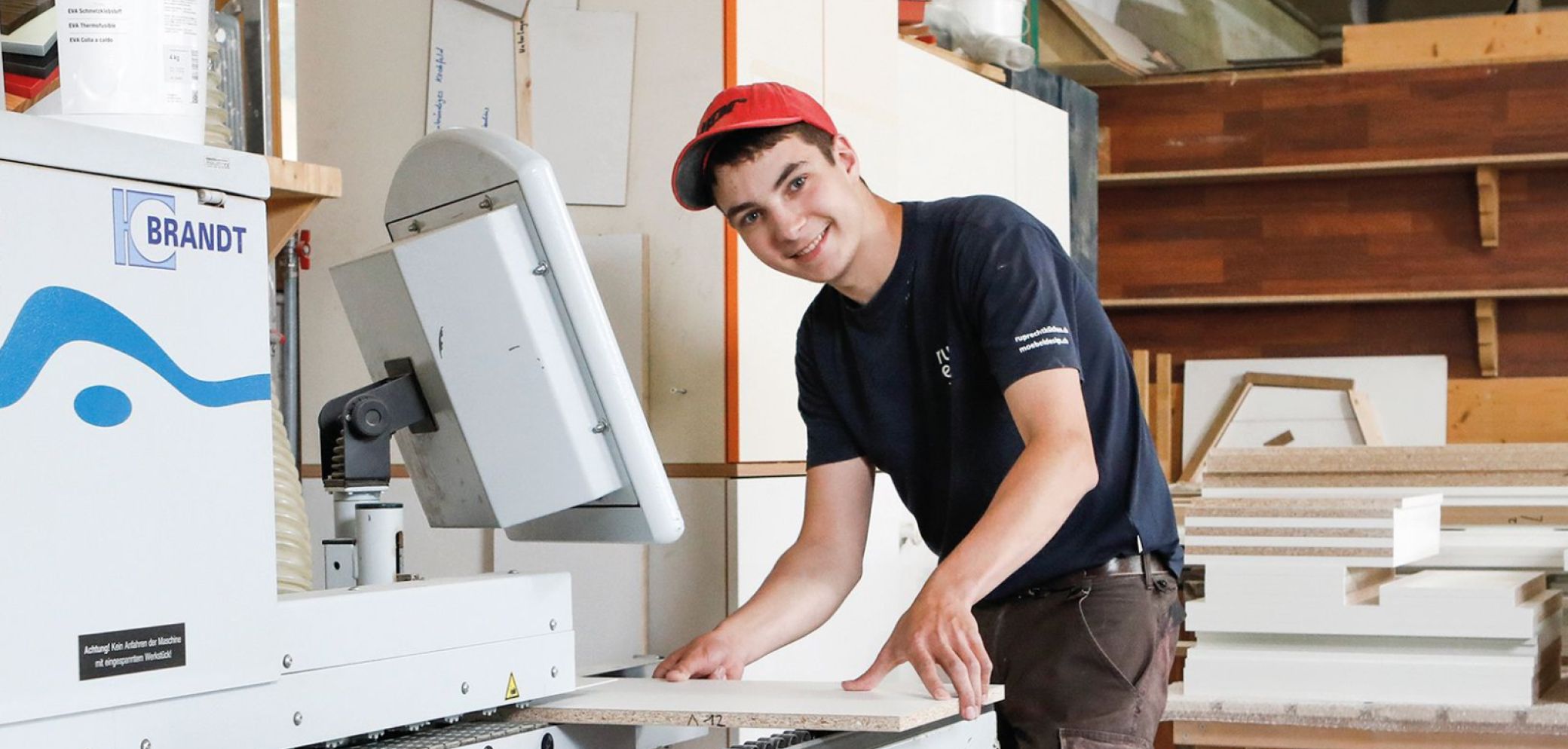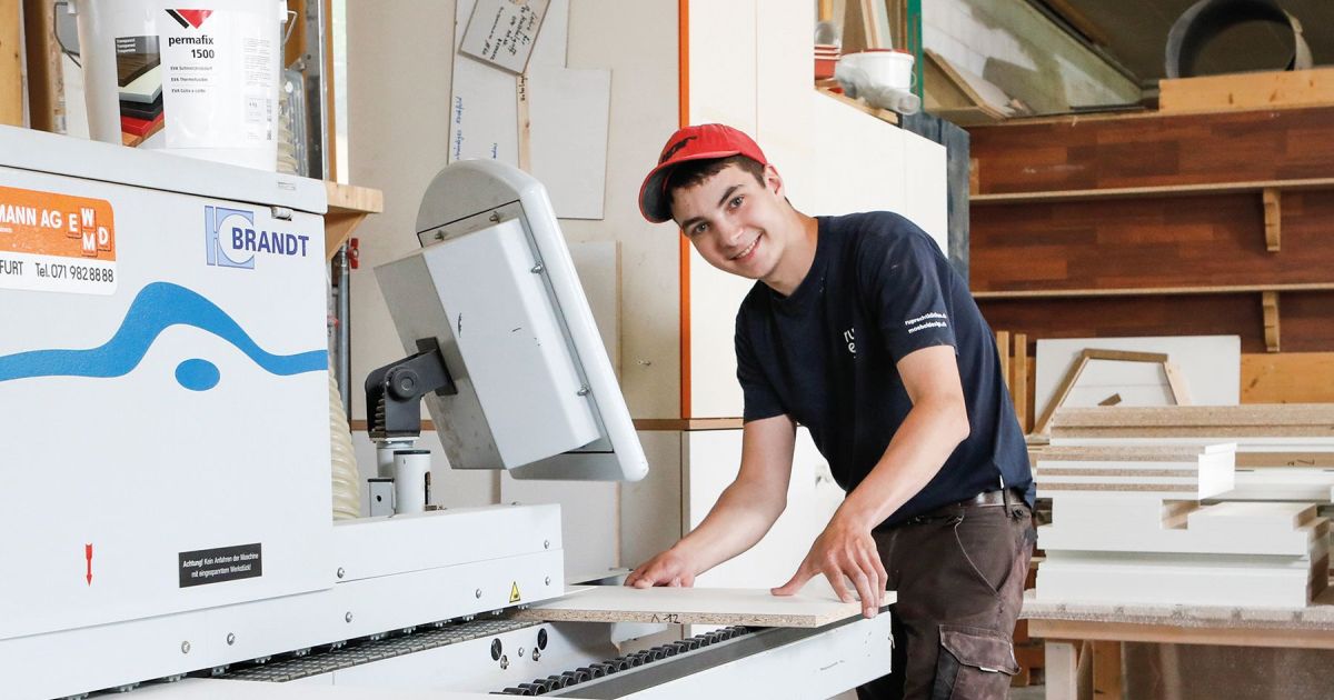 Die Lehrlingsausbildung wird bei Ruprecht Möbeldesign grossgeschrieben: Nachwuchsschreiner Yannick Trachsel an der Kantenleimmaschine. Bild: Permapack AG