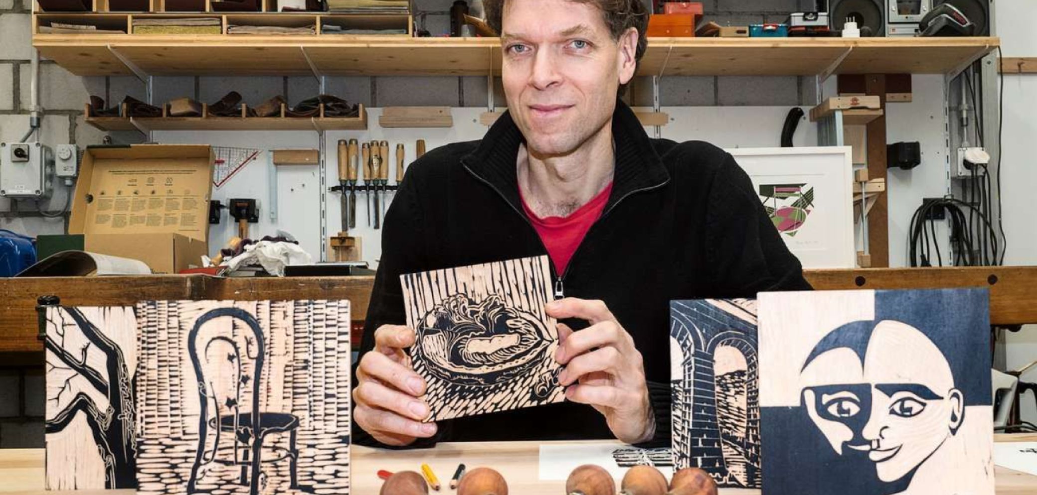 Ein Stuhl, aus dem Laub wächst. Eine Schiffsschraube. Eine Brücke, eine Maske, eine Nuss. Ein Baum mit knorrigen Ästen. Florian Hunziker legt die kleinen Druckplatten aus Holz vor sich auf den Tisch in seinem Schreinereibetrieb mitten in Frauenfeld TG. Die Sujets hat er selbst geschnitzt, in der mystischen Zeit «zwischen den Jahren», während der sogenannten Rauhnächte zwischen Weihnachten und Dreikönigstag. Das Schnitzen und die Rauhnächte gehören für den Schreiner untrennbar zusammen. Was er während der Rauhnächte träumt, schnitzt er in die Lindenholzplättchen, danach findet es im Hochdruckverfahren den Weg aufs Papier. Alles, was herausgeschnitzt ist, bleibt weiss – der Rest wird schwarz oder farbig. «Ich bin kein Esoteriker», sagt der gross gewachsene Vater dreier Kinder; auch Aberglaube, Orakel oder Prophezeihungen seien nicht seine Welt. Doch dass jede Rauhnacht einem Monat im neuen Jahr zugeordnet werde, habe ihn fasziniert. «Es nahm mich wunder, ob wirklich etwas daran ist. Weniger im Sinne einer Vorhersage, sondern eher, ob die Themen, die im Traum auftauchen, mich dann in jenem Monat wirklich umtreiben würden.» Und zu seiner Verblüffung sei genau das passiert: Was er in der fünften Rauhnacht träumte, spielte im Mai tatsächlich eine Rolle. In den ersten Jahren hielt er die Traumsujets fotografisch und zeichnerisch fest.
