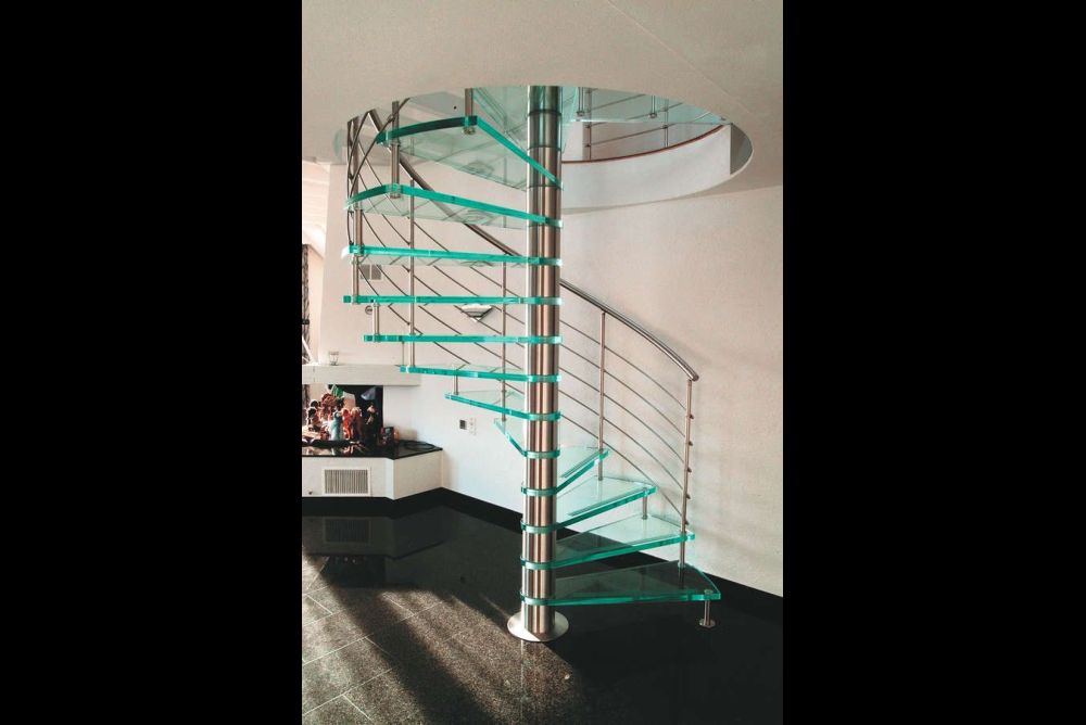 Das Zusammenspiel der Stufen mit dem Handlauf ermöglicht effektiv unendlich viele Gestaltungen, die einen Raum nicht nur in der Funktion bereichern. Können die Tritte an der Wand befestigt werden, entsteht die gleiche Situation wie bei sonst üblichen Treppen mit Wandbefestigung. Durch eine gummigelagerte Bolzenverbindung mit der Wand werden allfällige Schwingungen eliminiert, ohne dass Körperschall übertragen wird. Die Verbindung der Tritte mittels Bolzen ist auch zur Spindel hin möglich, wenn auch auf dieser Seite jeder Tritt mit dem darüber und darunter verbunden ist und ein tragendes Geländer verwendet wird. Welche Methode letztendlich zur Anwendung kommt, hat immer mit den gewünschten Materialien zu tun, aber auch mit der Funktion der Spindel. Ob eine Treppe als zusätzliches Element in ein Gebäude gestellt wird oder die Spindel gleichzeitig als tragende Säule Verwendung findet, macht einen grossen Unterschied. Bei Letzterem kann es gut sein, dass die gesamte Treppe mit der durchgängigen, einteiligen Spindel schon beim Aufbauen des Hauses gesetzt werden muss.