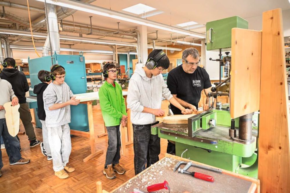 Mit der Herstellung eines Zopfbrettes konnten die Schülerinnen und Schüler selbst den Umgang mit der Hobelmaschine, der Tischkreissäge sowie der Kehl- und Schleifmaschine erleben. Vorbereitet war ein Brett aus Kiefernholz. Dieses liessen die jungen Leute als Erstes durch die Hobelmaschine. Schon da waren einige Augen gross vor Staunen. Anschliessend konnten sie unter Anleitung den aufgezeichneten Umriss des Zopfbrettes mit der Bandsäge aussägen, was viel Sorgfalt verlangte. Weiter ging es an der Kehl- und Schleifmaschine. Zum Schluss schliffen und ölten die Schülerinnen und Schüler das Zopfbrett von Hand. Dadurch bekamen die Teilnehmenden einen Eindruck von der Bandbreite der Arbeiten, die der Schreinerberuf mit sich bringt.