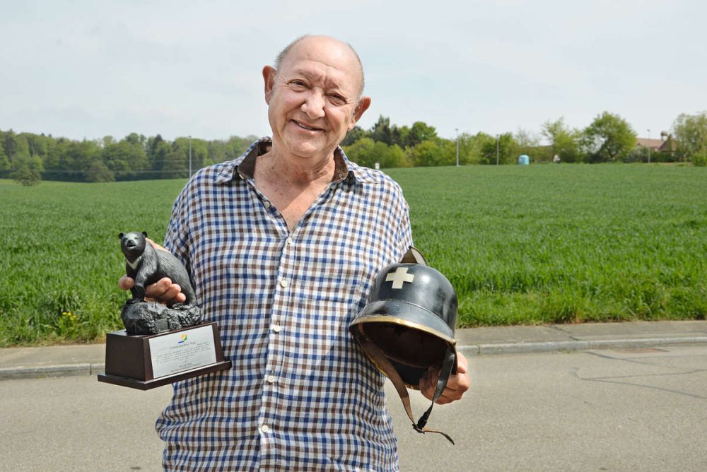 Den Bären hat der gelernte Schreiner und ehemalige Präsident der Weltfeuerwehr Walter Egger (70) in Korea geschenkt bekommen. Bild: Barbara Gasser