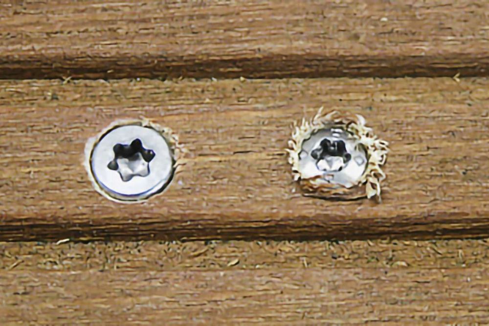 Mit «Easypat» hat Berner eine Terrassenbauschraube entwickelt, die entweder aus dem martensitischen Edelstahl «Easypat martensitisch» oder aus Edelstahl A4 bzw. «Easypat A4» besteht. Die martensitische Ausführung hat einen Korrosions-Schutz, der zwischen verzinkt und Edelstahl A2 eingeordnet werden kann, bietet jedoch nicht genügend Schutz bei Hölzern mit einem hohen Gerbsäureanteil, wie beispielsweise bei Akazie, Eiche, Lärche oder Zeder. Hier gilt es, die Ausführungsvariante «Easypat A4» einzusetzen, damit die Oxi- dationen vermieden werden. Der Zylinderkopf verhindert das Spanaufstellen, die Kerbspitze das Aufspalten der Dielen, und das Reibegewinde am Schaft vermindert den Eindrehwiderstand um bis zu 25 Prozent. Bei der Verarbeitung von Terrassendielen wird das Vorbohren mit dem 0,6- bis 0,8-Fachen des Schraubendurchmessers empfohlen.