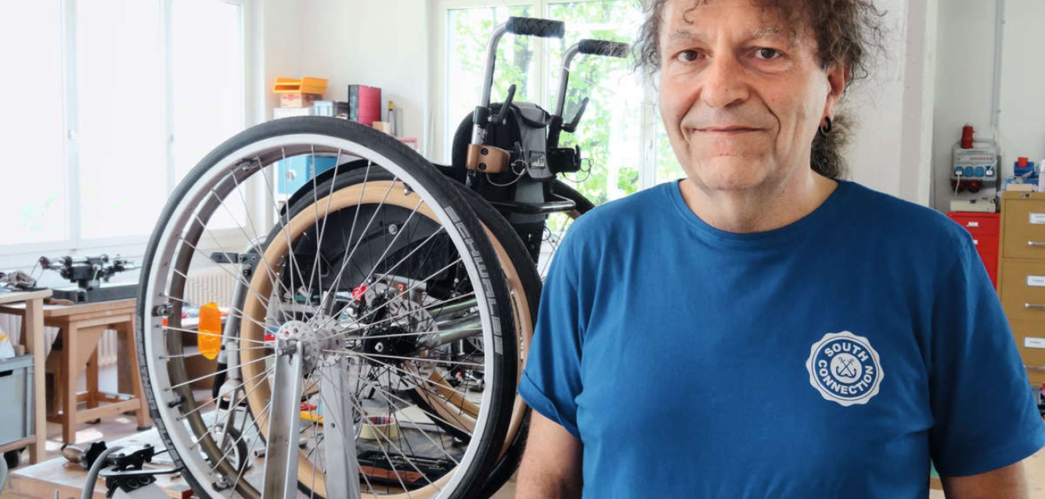 Mehrere Rollstühle stehen säuberlich aufgereiht in der grosszügigen Werkstatt in Zollikofen BE. Gerade erhält ein sogenanntes Handbike, welches vorn am Rollstuhl angebracht werden kann, um Sport zu treiben, einen Gepäckträger. Mittendrin steht Andreas Buser – mit seinem Lockenkopf eine auffällige Erscheinung. «Ja, als Rollstuhl-Tuner kann man mich schon bezeichnen», erklärt er, angesprochen auf seine Tätigkeit. Doch wie kam der gelernte Schreiner, der auch schon als Kurierfahrer und Leiter einer Event- und Werbeabteilung gearbeitet hat, zum Rollstuhl? «Meine Lebenspartnerin sitzt im Rollstuhl. Und da sah ich als begeisterter Handwerker so manches, was man verbessern kann.» Aus dieser Ursprungsidee ist 2014 ein Unternehmen entstanden. Noch repariert und optimiert Buser vor allem bestehende Rollstühle: So zentriert er etwa Räder und spannt Speichen, damit die Räder rund laufen. Doch eigentlich möchte er den Rollstuhl von Grund auf neu entwickeln; einen Schweizer Rollstuhl schaffen, welcher mehr Komfort bietet. Warum sind Rollstühle ungefedert und weshalb kann die Bremse nicht dosiert werden? Solche Fragen treiben den 58-Jährigen an. Bei einigen ist er kurz davor, eine Antwort zu liefern. So liess er bereits ein Bremssystem mit Scheibenbremsen und Joystick-Bedienung patentieren, welches er nun in Kleinserie rea-lisieren will. Noch fehlt das Geld, doch er ist guten Mutes. Bisher finanziert die Invalidenversicherung nur herkömmliche Rollstuhlbremsen, die von Hand bedient werden und nicht dosierbar sind.
