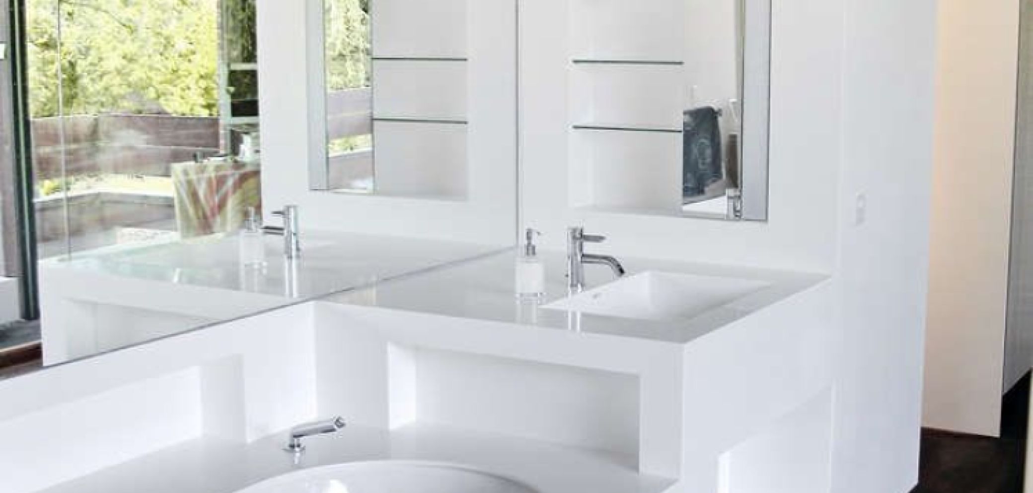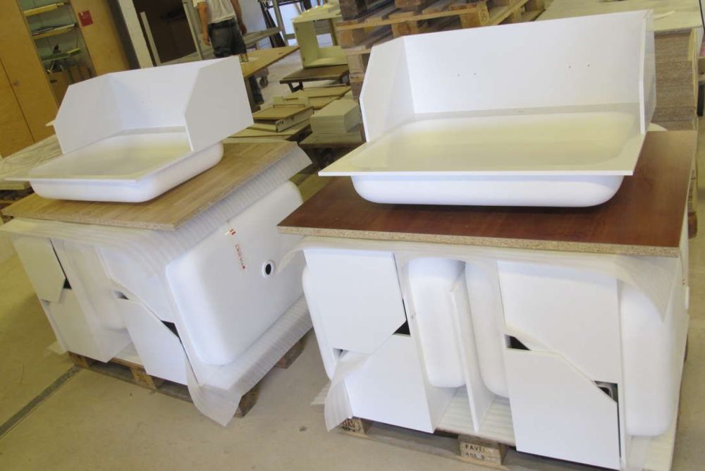 Sehr viele Endkunden wollen durchgehende Waschtische mit integrierten Becken und darunter einen Korpus aus Holz oder Holzwerkstoffen – diese Arbeitsaufteilung ist einfach. Vermehrt werden jedoch komplette Aussenverkleidungen aus Mineralwerkstoffen gewünscht – das erfordert dann schon etwas mehr Zusammenarbeit, damit die Komponenten dauerhaft zusammenpassen.