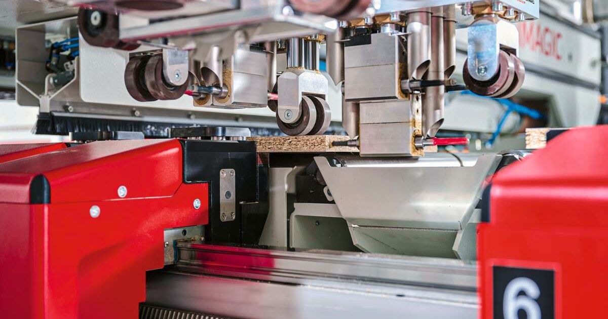 Die vielfältigen Bestückungsmöglichkeiten auf beiden Seiten der Bearbeitungs-Supporte gestatten laut Hersteller jederzeit eine optimale Aufteilung der Bearbeitungen sowie, abhängig von den Bauteilen, auch eine parallele Bearbeitung an der Support-Vorder- und -Rückseite. Ob reine Bohrbearbeitung oder eine beliebige Kom- bination aus Fräsen, Bohren, Dübeln und Beschlagsetzen – die Kundenanforderung bestimmt die Auslegung der Maschine.