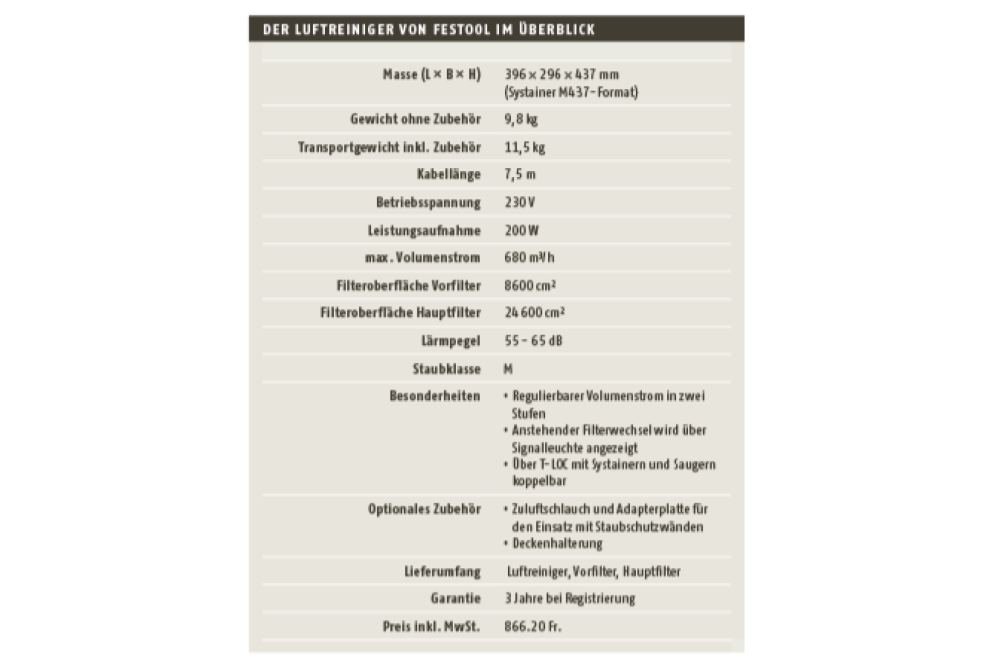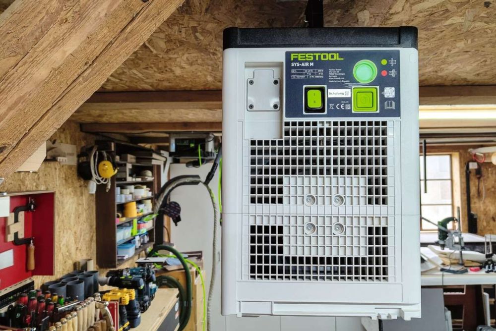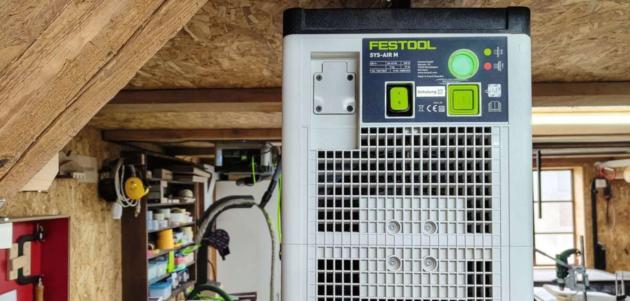 Genau bei dieser Problematik soll der Luftreiniger «SYS-AIR M» von Festool Abhilfe schaffen. Dieser filtert nämlich die schädlichen Schwebstäube der Staubklasse M aus der Luft, die trotz fachgerechter Absaugung nicht erfasst werden. Festool verspricht unter anderem mehr Sauberkeit, weniger Reinigungsaufwand und eine verbesserte Luftqualität durch den Einsatz des Gerätes. Verbesserungen, die ich in meiner Werkstatt sofort begrüssen würde. Deshalb war ich gespannt, ob der Luftreiniger diese Versprechen auch einlösen kann.