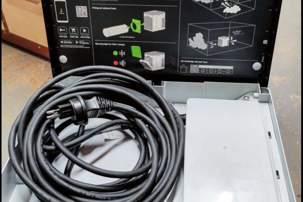 Das Gerät an sich ist recht überschaubar und die Bedienung im Prinzip selbsterklärend. Die ganze Technik findet im Systainer (Format M437) Platz, und auch das 7,5 Meter lange Kabel lässt sich zusammengerollt darin verstauen. Nebst dem Ein/Aus-Schalter findet sich ein Kippschalter am Gerät für die Wahl des Volumenstromes, und eine Signalleuchte leuchtet rot, sobald der Filter zu stark verschmutzt ist. Im normalen Betrieb leuchtet sie grün. Viel falsch machen kann man also nicht – und andernfalls findet sich auf der Innenseite des Systainer- deckels eine praktische Kurzanleitung für den Betrieb des Gerätes. Auch eine Tabelle zur Berechnung der Luftwechselrate ist dort abgebildet, da diese natürlich je nach Raumgrösse variiert. Demnach darf ich in meiner Werkstatt (ca. 7 × 8 × 2,5 m) mit einer 3-fachen Luftwechselrate pro Stunde rechnen, wenn der Luftreiniger auf der zweiten Stufe läuft.