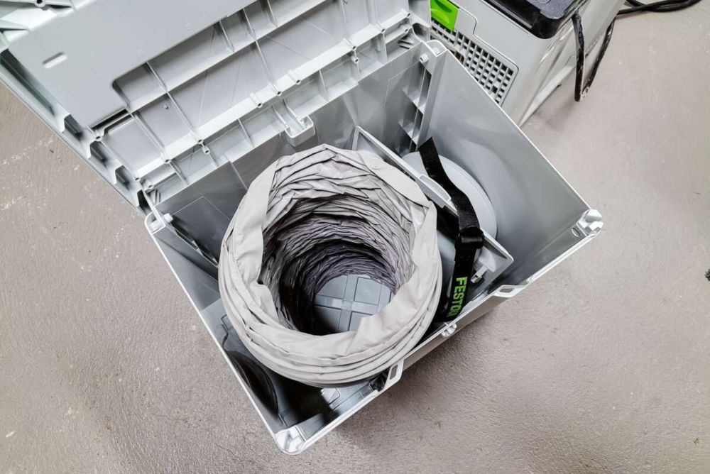 Wie Festool schreibt, kann der «SYS-AIR M» nicht nur in der Werkstatt, sondern auch mobil auf der Baustelle bei Abriss- oder Renovierungsarbeiten zum Einsatz kommen. Für Staubschutzwände oder für schwer zugängliche Stellen gibt es einen 6-Meter- Zuluftschlauch als optionales Zubehör. Mit dabei: eine Adapterplatte und ein Gurtband zur Befestigung des Schlauches. So ist die Montage in wenigen Handgriffen und ohne Werkzeug möglich, was ich positiv hervorheben möchte. Generell ist das Handling des Gerätes denkbar einfach, und auch die Filter sind werkzeuglos zugänglich. Aber dazu später mehr.