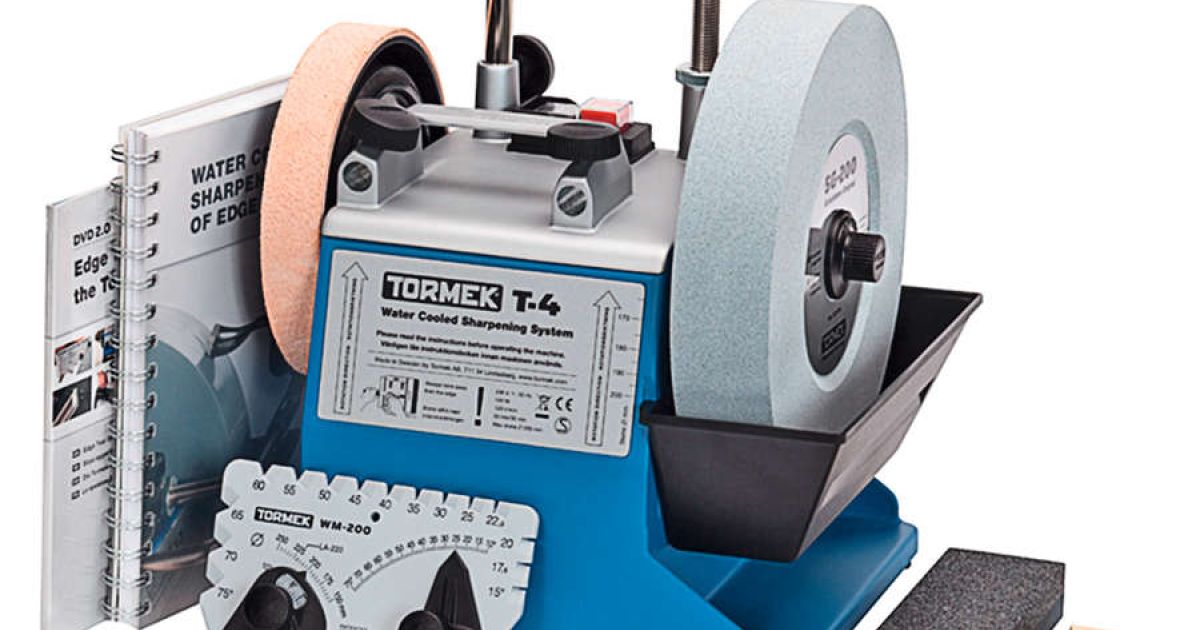 Die «T-4» von Tormek ist eine Weiterentwicklung des Modells «T-3». Wichtige Funktionen, wie Motor und Hauptwelle, sind jetzt im gegossenen Oberteil montiert. Auch die Buchsen für die Universalstütze als Basis aller Vorrichtungen sind integriert. Der Schleifstein läuft im Wasser und kühlt somit die Werkzeugschneide. Diese wird dadurch nicht überhitzt und behält ihre Härte. Stahlpartikel und abgenutzte Schleifkörner sammeln sich im Wasserbehälter. Und wo weder Schleifstaub noch Funken entstehen, wird auch die Luft nicht verunreinigt. Es besteht laut Hersteller somit keine Feuergefahr. Die Lederabziehscheibe, die mit Abziehpaste imprägniert ist, poliert im Anschluss die Schneide auf Rasiermesserschärfe.