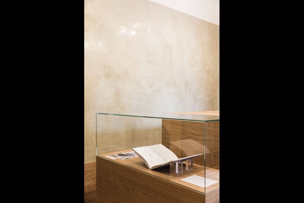 Die Materialvorgaben nahm Remo Derungs, Mitbegründer von Gasser Derungs Innenarchitekturen, in sein Ausstellungskonzept auf. So setzt sich das Täfer vom Empfang in veränderter Form in der «Schatzkammer» fort. Es verläuft ringsum entlang der Wände und dient dadurch auch als Radiatorenverkleidung.