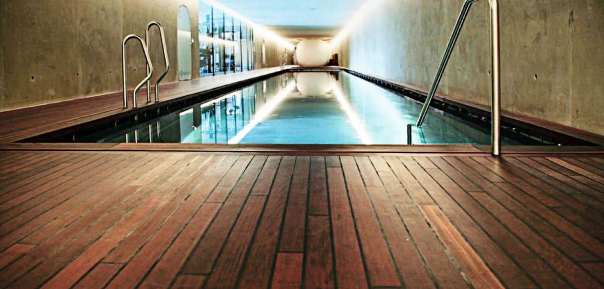 Hier bewährt sich der «Linea Aqua Schiffsdeckboden» von Graf Parkett, der am Pool im Freien wie auch in der Wellnesszone im Innern zur Anwendung kommen kann. Die Fugen werden wasserdicht mit Neopren verschlossen. Das ist ein hochelastisches Dichtungsmittel, wie es heute auf Schiffen und Jachten eingesetzt wird. Es passt sich dem Quellen und Schwinden des Holzes optimal an. Das Dreischichtparkett ist oxidativ geölt und mit verschiedenen Oberflächenstrukturen erhältlich. Es hat eine Nutzschicht von 4 mm und wird vollflächig verklebt.