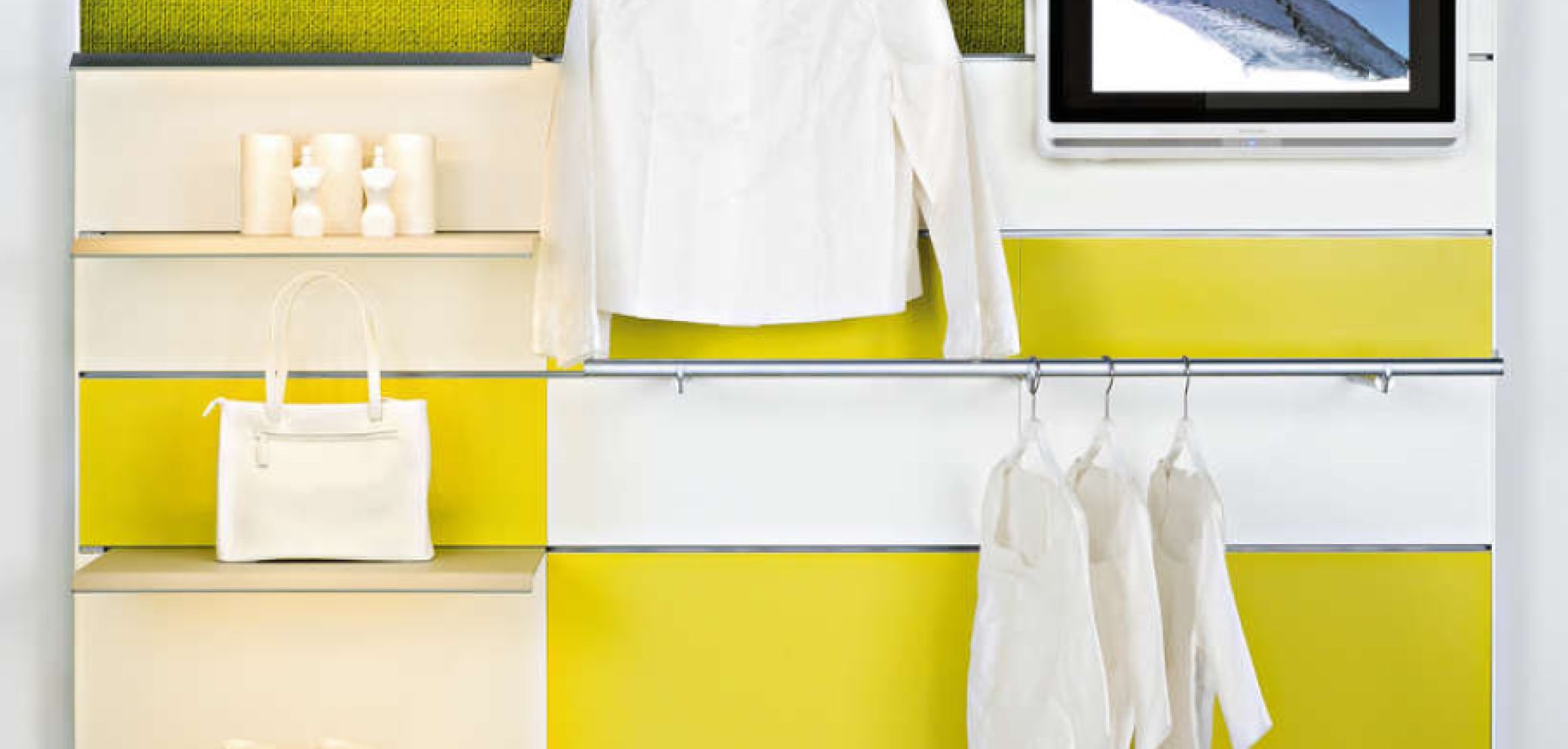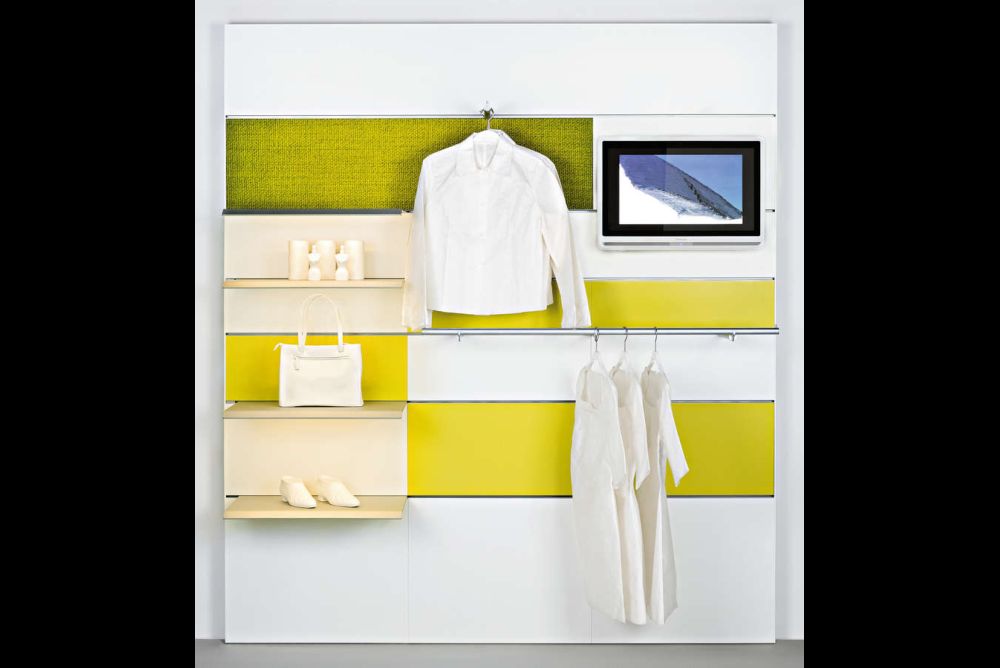 «Invisible» ist die bewährte horizontale Tragschiene von Visplay mit verborgener Technik. Warenträger, Paneele und ganze Module lassen sich einfach ins Profil einstecken und werden wie von unsichtbarer Hand gehalten. Mit «Change» ist «Invisible» jetzt noch flexibler und bildet ein neues Shop-Design. «Change by Invisible» – Einfach und ohne Umbau lassen sich die Paneele aus der Rückwand entnehmen und gegen neue, verschieden grosse Paneele aus Hartbelag, Holz, stoff- oder folienbespannten Elementen austauschen. Die «Invisible 6 P/L»-Profile können innerhalb eines Rasters beliebig in der Höhe verstellt werden. Das erlaubt die einfache und flexible Anpassung an neue Warengruppen mit anderen Rastermassen. So kann man sich ohne grossen Aufwand mit Farben und Bildern auf die neue Saison einstellen sowie direkt auf wechselnden Warendruck und neue Sortimente reagieren.
