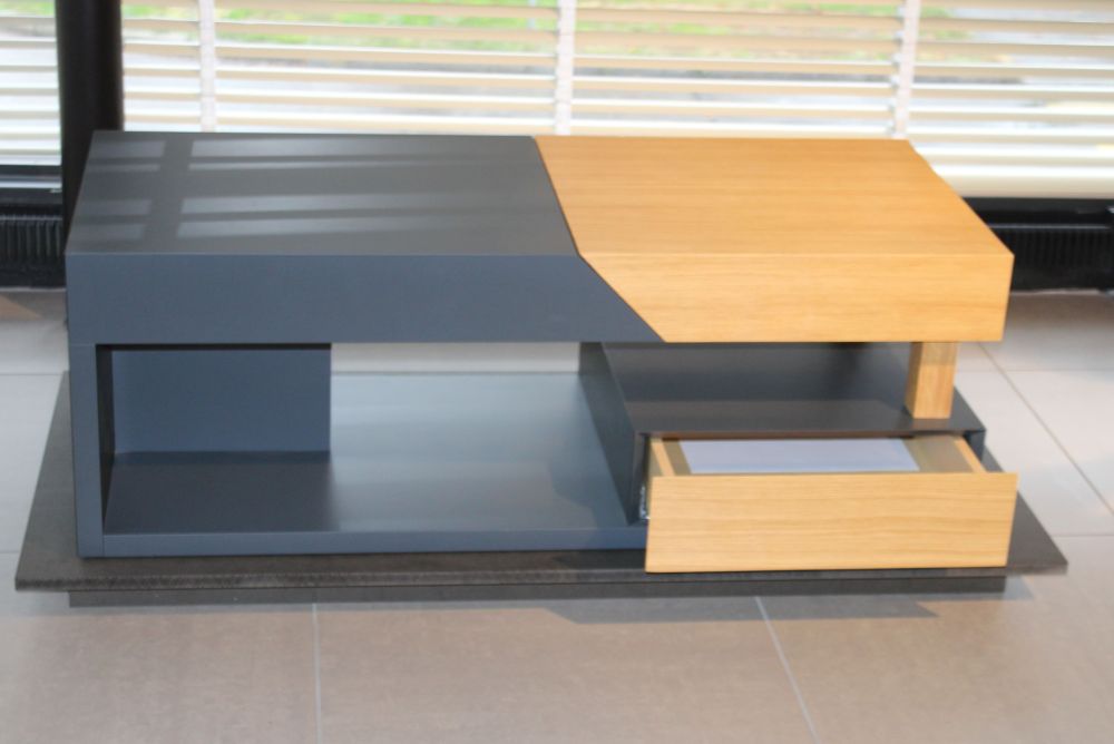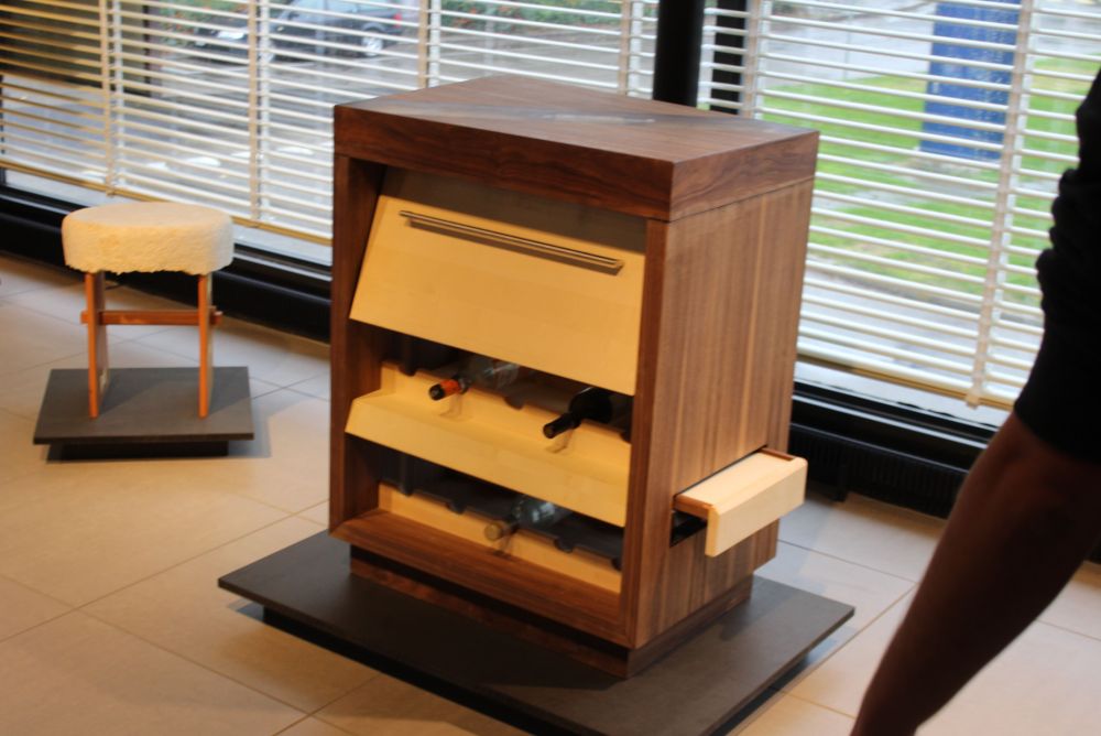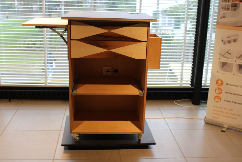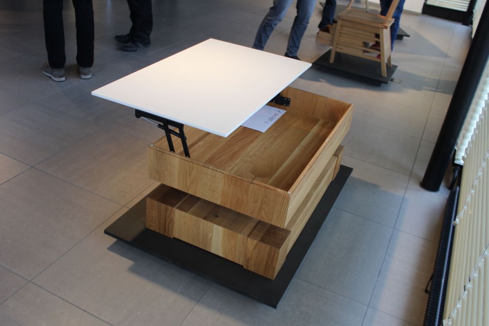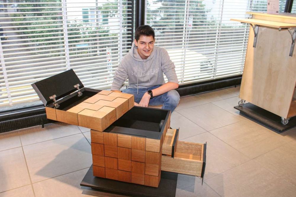 Der zweite Gewinner ist Yanick Müller. «Ich habe mich geärgert, dass unser Couchtisch unaufgeräumt ist. Also habe ich einen mit genügend Stauraum und elegantem Design entworfen», erzählte der 17-Jährige, der bei der Büchi AG in Liestal BL angestellt ist. «Wenn die Fächer geschlossen sind, sieht das Möbel von allen Seiten gleich aus.» Die Quadrate hat er aus schwarzem MDF in Eiche furniert in drei und fünf Millimeter Dicke hergestellt.