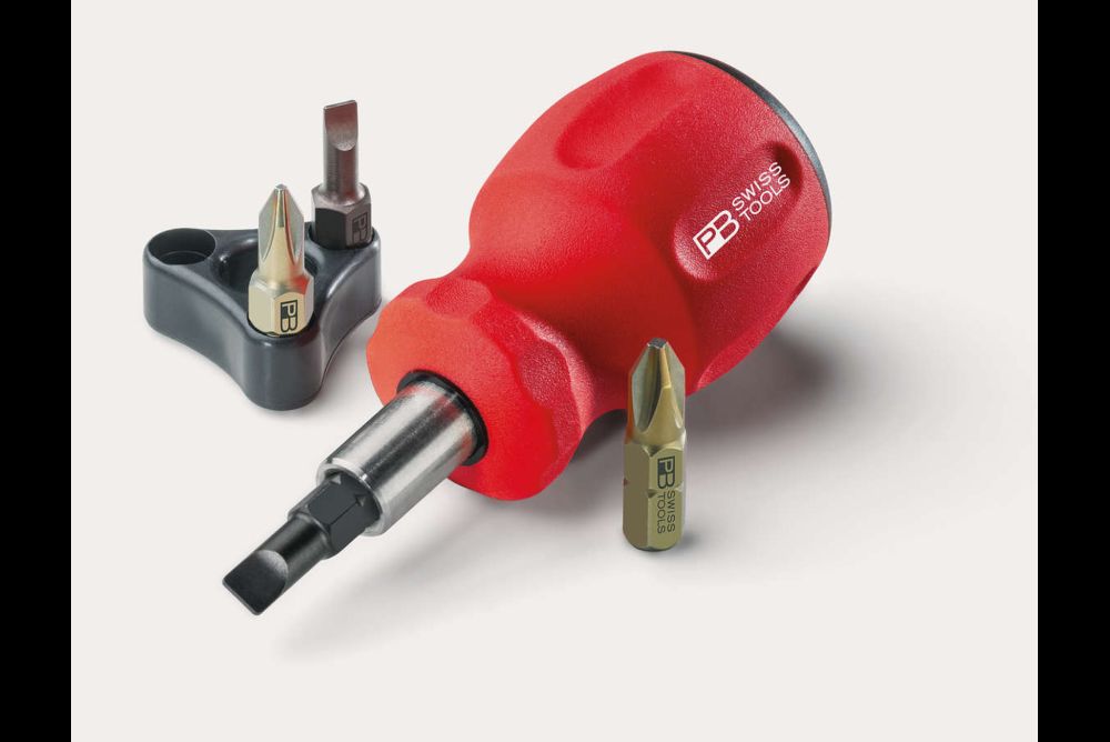 Der Bitschraubenzieher im Faustformat heisst «Stubby» und kommt von PB Swiss Tools. Er hat ein kleines Bitmagazin und vier «PrecisionBitsC6» 0,25" dabei. Diese werden an beiden Orten magnetisch gehalten. Diese Kurzform ermöglicht es überall, wo der Zugang zum Schraubenkopf sehr eingeschränkt ist, verschiedene Bits anzuwenden. Der grosse Griffdurchmesser mit der flach bombierten Kopfpartie verhilft mit der grosszügigen Fingerkerbe zu einer guten Handhabung ohne Kraftaufwand.