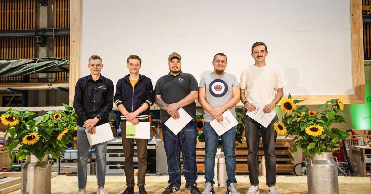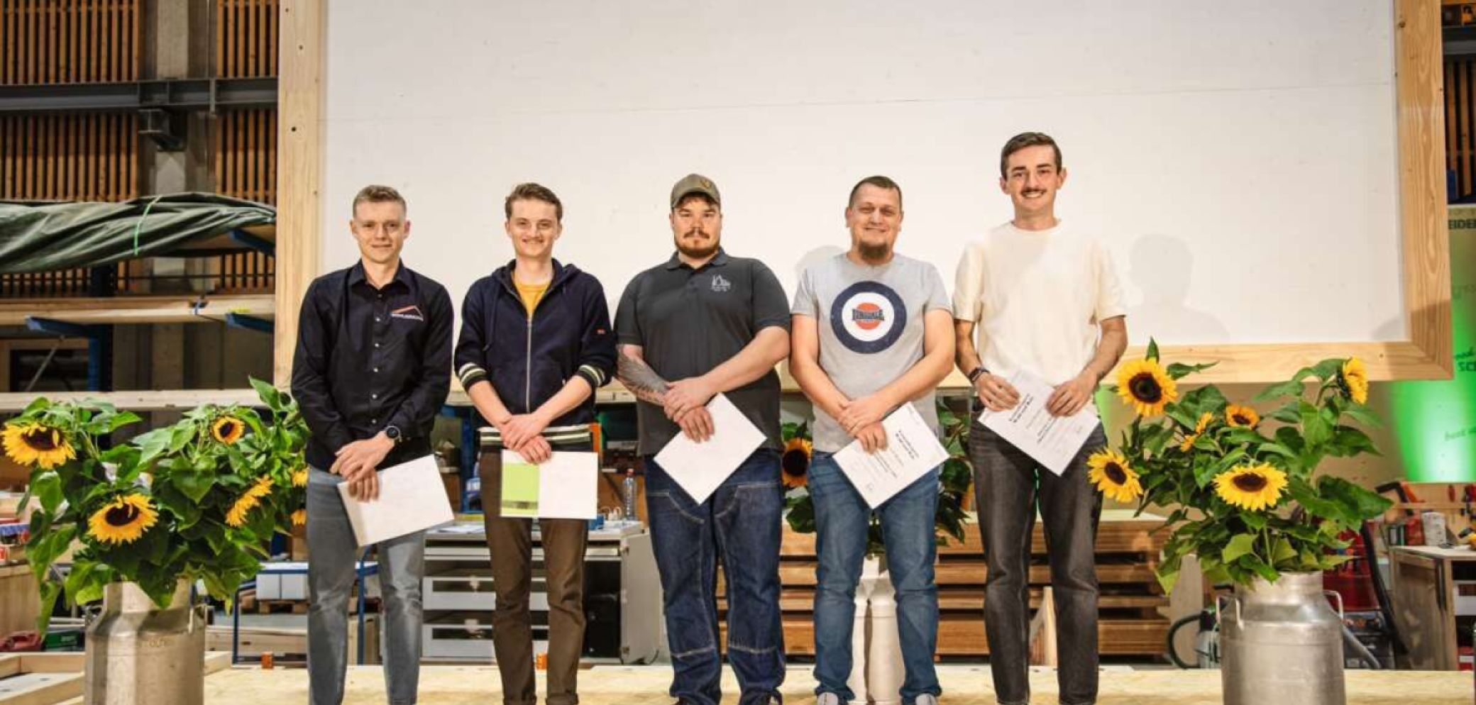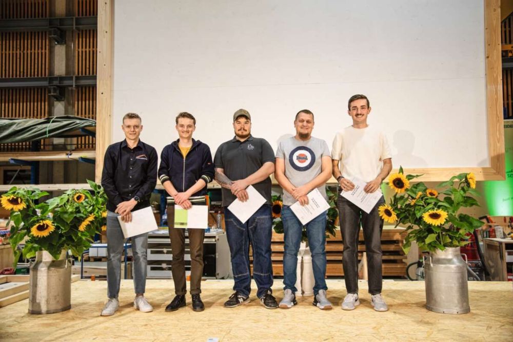 Anschliessend wurden die jeweils besten Absolvierenden der Lehrberufe der Wald- und Holzbranche ausgezeichnet. Die Lernendenpreise 2025 gehen (im Bild v. l. n. r.) an Janis Borer (Zimmermann), David Ochsenbein (Schreiner Bau/Fenster), Fabian Hädener (Forstwart), Mersed Hodzic (Schreinerpraktiker) und Luca Gerber (Schreiner Möbel/Innenausbau). SZ