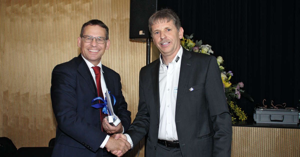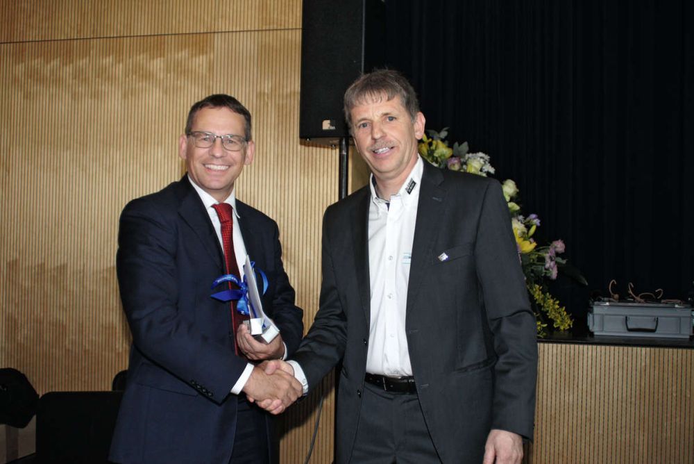 David Kläusler (r.) bedankt sich bei Urs Fischer, Direktor der Ausgleichskasse Schreiner, für seinen Einsatz. Bild: PD