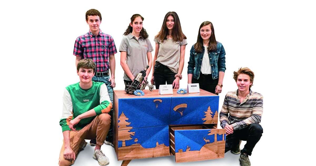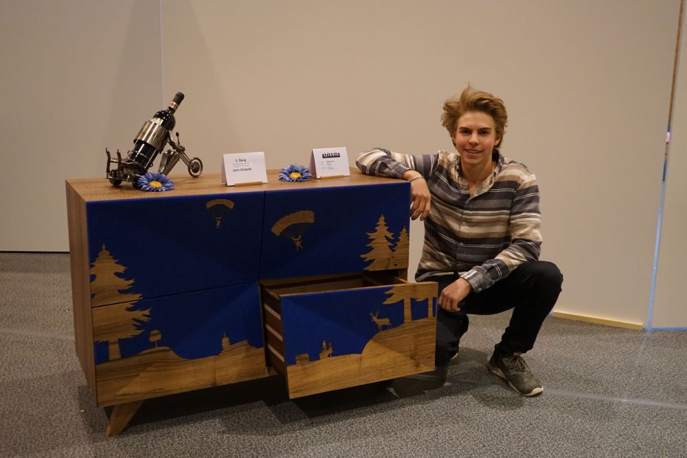 Überragender Sieger war Jann Diebold aus Walzenhausen. Der Auszubildende im dritten Jahr der Anhorn AG, Heiden/Wolfhalden, kreierte eine Kommode mit vier Schubladen, deren blaue Deckflächen ins Auge springen. In aufwendiger Laubsägenarbeit hat er eine Landschaft mit Tannen, Tieren und zwei Fallschirmspringern ausgeschnitten und aufgeleimt. Die restliche Fläche füllte er mit blauem Epoxidharz, wodurch diese wie ein eindunkelnder Himmel scheint. Zudem sind die Flächen entlang der Diagonalen zueinander angewinkelt. Das macht die Verarbeitung anspruchsvoll und sorgt auch für eine Leichtigkeit und einen lebendigen Eindruck.