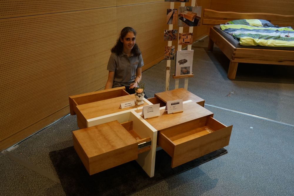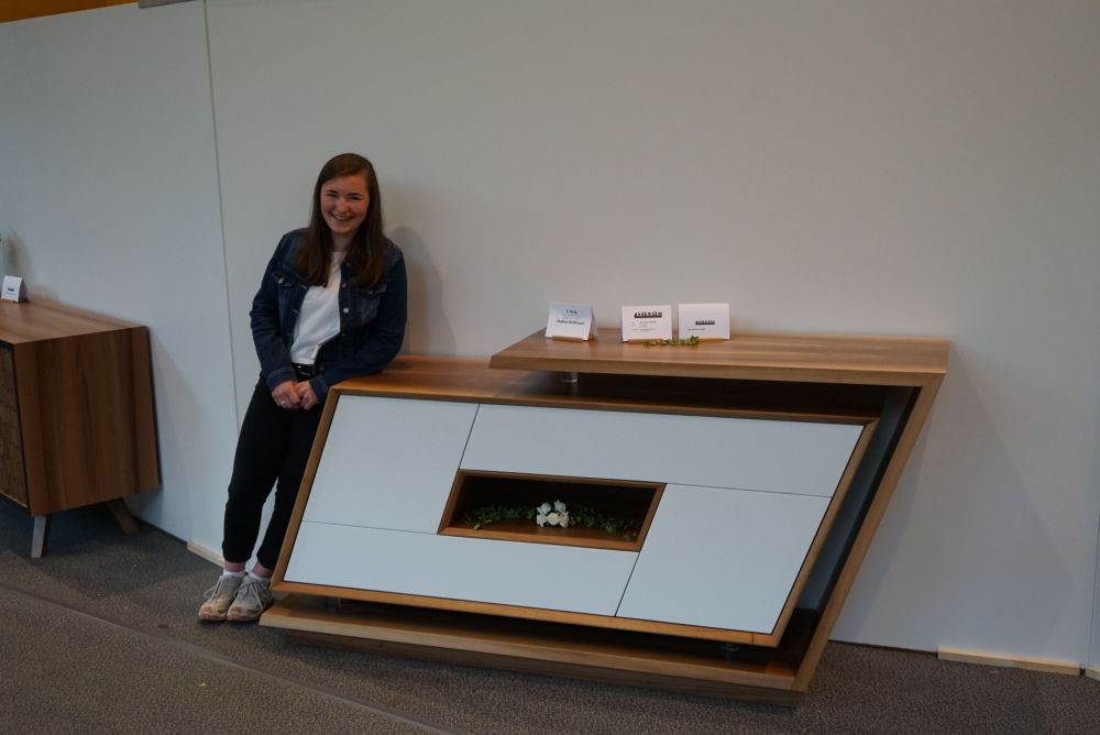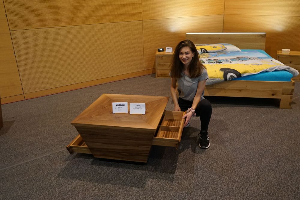 Auf den ersten Blick sieht man beim Möbel von Rahel Zellweger aus Teufen (Thomas Sutter, Haslen) ein schlichtes Salontischchen aus Nussbaumholz. Man muss testen, auf welcher Seite sich wo eine Schublade öffnet – eine gelungene und kreative Spielerei, die ihr den Sieg in der Kategorie 1./2. Lehrjahr einbrachte. Die konische Form verleiht dem Möbel Leichtigkeit und erhöht den Schwierigkeitsgrad. Zweite wurde Lea Preisig aus Schwellbrunn (Blumer Schreinerei AG, Waldstatt). Die Jury lobte ihre Arbeit als eine sensationelle Schubladen-Kreation. Ihrem Salontisch sieht man die Schubladen nicht an. Mit Marcel Fuchs aus Schlatt (M. Mazenauer AG, Meistersrüte) schaffte es ein Lernender im ersten Jahr als Dritter aufs Podest. Sein TV-Möbel aus massiver Eiche sei eine Wucht. Laut Jury mit einer grandiosen Oberfläche und speziellen Effekten.