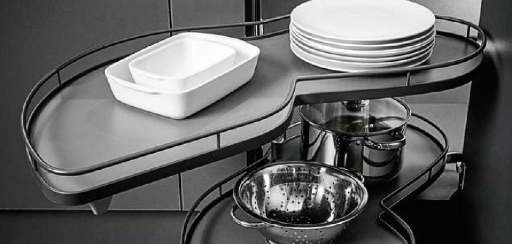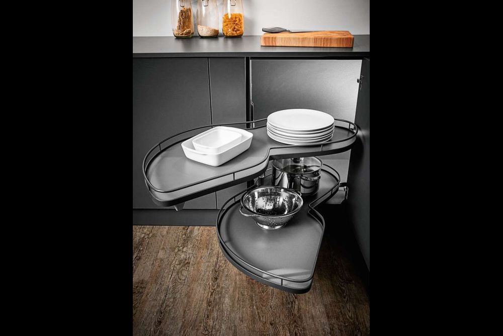 Die Peka-Metall AG vertreibt in der Schweiz ebenfalls den «Le Mans II» von Kesseböhmer. Den Schwenkbeschlag gibt es für Korpusbreiten von 800 bis 950 mm und Frontbreiten von 450 bis 600 mm. Die beiden Tablare lassen sich individuell in der Höhe verstellen und tragen jeweils maximal 25 Kilogramm.
