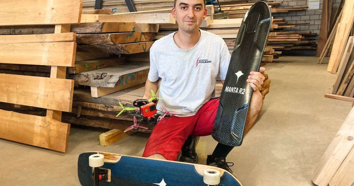 Matteo Bussinger (20) mit den Gerätschaften für seine Hobbys: einer Drohne und den Longboards, die er als Schreiner selbst herstellt. Bild: Manuela Ziegler