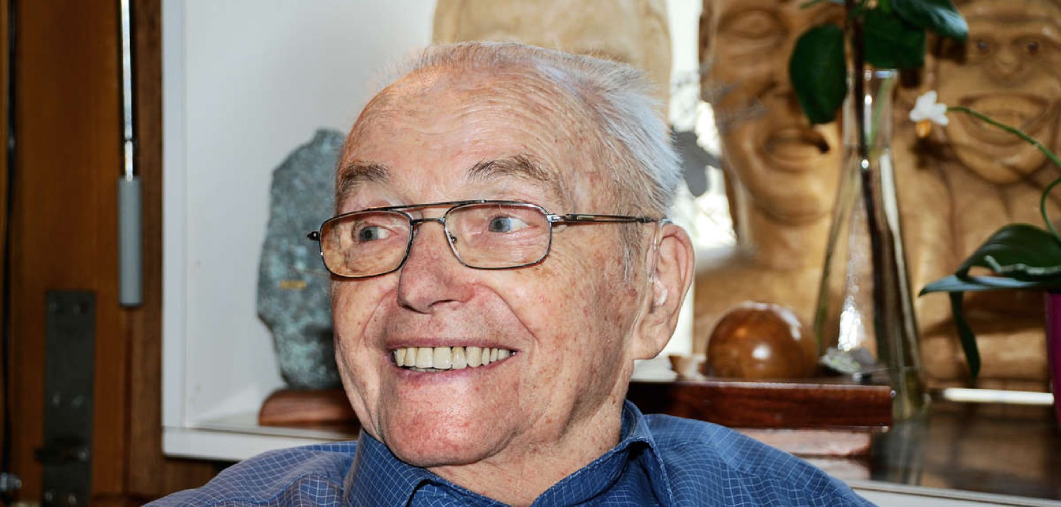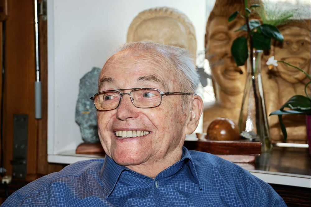 Fritz Zorn (90) in seinem Wohnzimmer, hinter ihm stehen Holzfiguren. Bild: SZ, Martin Freuler