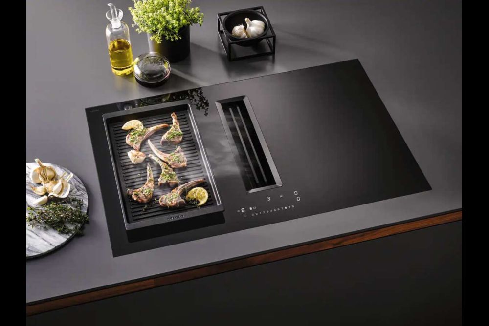 Miele erweitert sein Portfolio bei den Induktionskochfeldern mit integriertem Dunstabzug. Der Neuzugang ist erstmalig vollständig in Schwarz gestaltet und verbindet, laut Firmenangaben wie alle «Two In Ones», das Beste aus den deutschen Miele-Kompetenzzentren. Leistungsstark und leise arbeitet das Lüftungssystem mit dem «Silence»-Motor. Und dank der «Powerflex XL»-Kochzonen finden hintereinander auch zwei grosse Töpfe oder ein Bräter ihren Platz auf dem Kochfeld. Die schwarze Bedruckung der Kochzonen sowie ebenfalls schwarze Streben beim flächenbündigen Abdeckgitter in der Mitte der Glaskeramik wirken zurückhaltend elegant. Und selbst der Fettfilter im Inneren des Gerätes ist für ein einheitliches Gesamtbild schwarz eingefärbt. Die «Comfortselect White»-Bedienung ist im ausgeschalteten Zustand nur über den Ein-/Aus-Schalter zu erkennen. Erst durch einen sanften Fingertip erscheint die weisse Steuerung direkt unterhalb des Dunstabzugs, mit je einer Anzeige für jede Kochzone und den Lüfter.