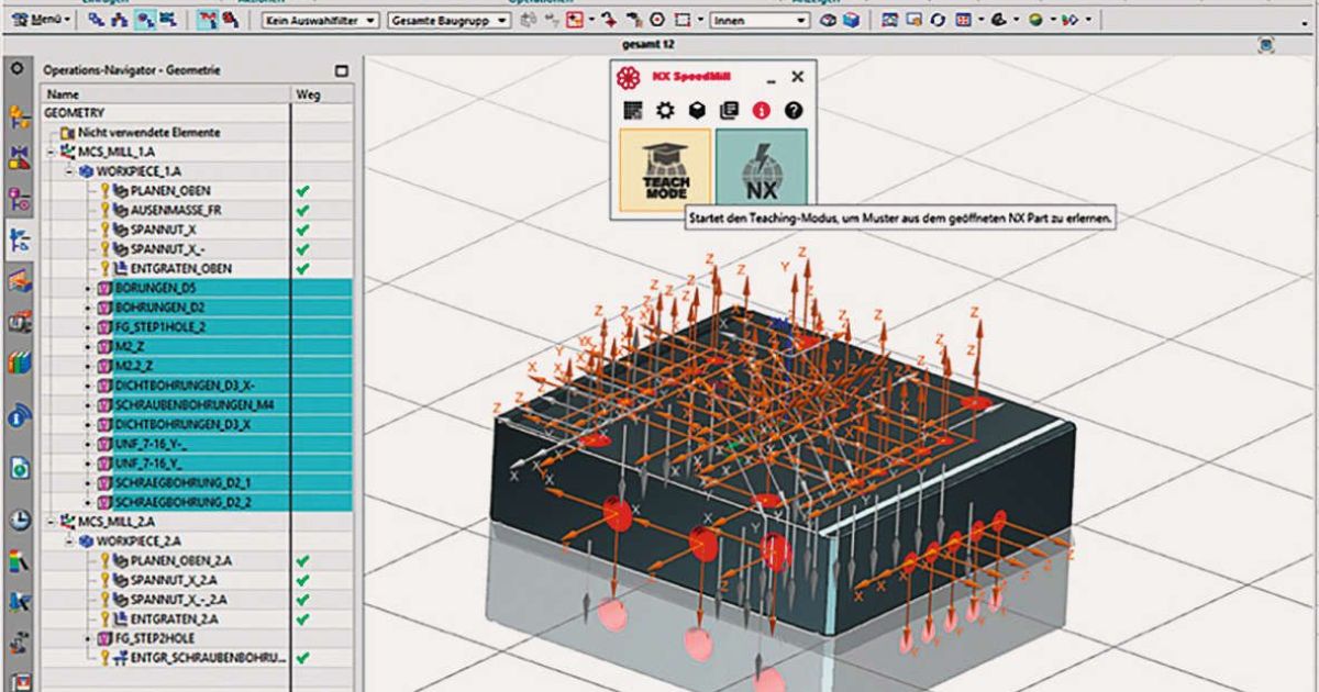 Das Softwaremodul «SpeedMill», ein Add-on für die Software «NX CAM» von Siemens, entlastet Programmierer von Routine-arbeiten, denn es ist selbstlernend. Sobald der Anwender Werkzeug und Arbeitsoperation für eine Geometrie erstellt hat, speichert er die Geometrie- und Operationsbeschreibungen in einer Datenbank – per Knopfdruck als automatisierbare Vorlage. Lädt der Programmierer dann das CAD-Modell für ein neues Werkstück, analysiert das Programm die Geometrien und lädt automatisch die passende Vorlage – sofern eine ähnlich zu bearbeitende Geo- metrie schon bekannt ist. «SpeedMill» bedeutet für «NX CAM» einen weiteren Evolutionsschritt hin zur Automatisierung der NC-Programmierung.