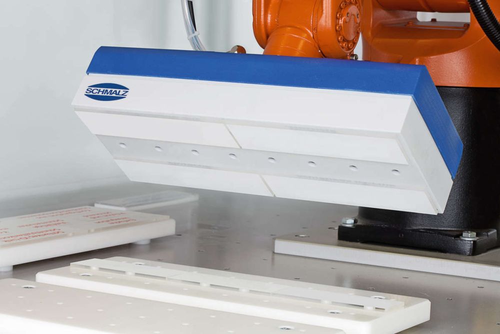 Der Vakuum-Spezialist Schmalz bietet neu einen Matrixgreifer für die flächige Handhabung flexibler und forminstabiler Werkstücke. Der Greifer ist modular aufgebaut, einfach konfigurierbar und überzeugt mit einem schlanken Schnittstellenkonzept, was beispielsweise den Verdrahtungsaufwand reduziert. Wenn eine selektive und vor allem flexible Entnahme von unterschiedlicher Grösse, Form und Beschaffenheit erforderlich ist, können die einzelnen Saugstellen des Greifers hierzu separat angesteuert werden. Neben dem präzisen Ablegen verschafft das flächige Greifen Mass- und Formhaltigkeit ohne Verziehen.