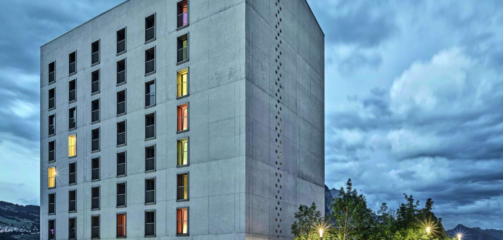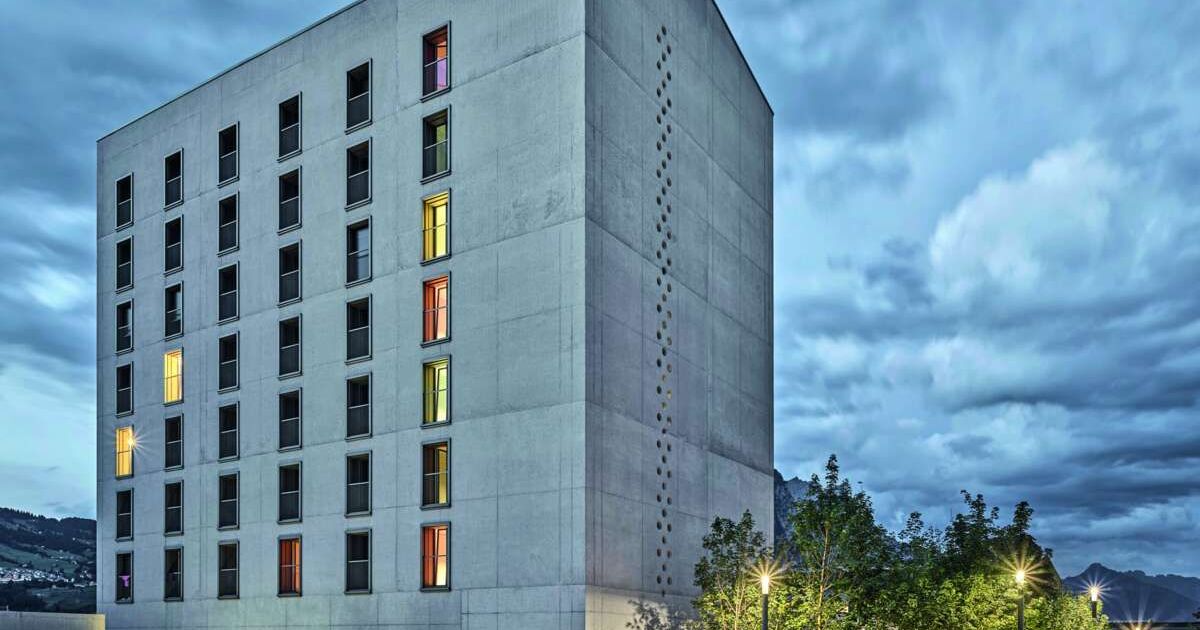 Auch wenn das nicht gleich ersichtlich ist, das Hotel des Sportzentrums im glarnerischen Filzbach, im Bild oben, ist ein Modulbau – jedenfalls hinter der vorgängig erstellten Aussenhülle aus Beton. Dieses Gebäude ist somit ein Holzbau, der in diese grosse, graue Hülle hineingestellt wurde – nicht am Stück, sondern in fertigen Elementen, die in ihrer Grösse noch sicher per Lastwagen transportiert werden konnten.