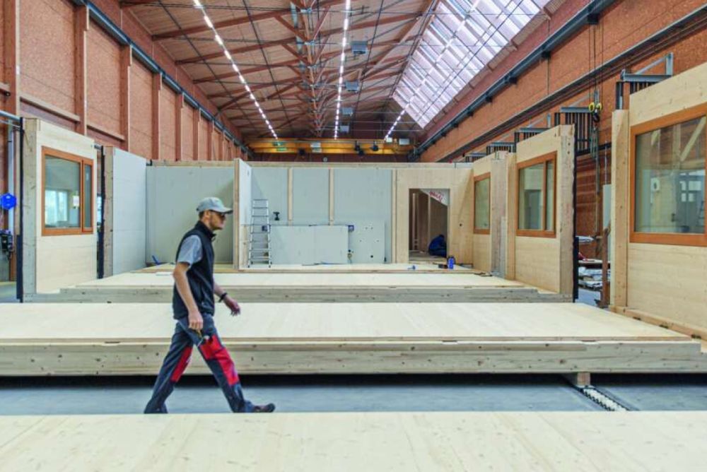 «In der Regel braucht es für den Grossteil der modularen Bauten Schreinerprodukte», bemerkt Marlen Egloff von der Erne AG Holzbau in Laufenburg AG. Die Zusammenarbeit mit Schreinerbetrieben ist somit sehr wichtig. Als Partnerbetrieb muss die Schreinerei den Holzbaubetrieb effizient ergänzen. «Es ist wichtig, dass die digitale, dreidimensionale Planung beidseitig stattfindet und der Datenaustausch reibungslos funktioniert», weiss Simone Agosti von der Blumer-Lehmann AG in Gossau SG. Die Zeitschiene der jeweiligen ausführenden Zusammenarbeit richtet sich nach dem Produktionsablauf in der Werkhalle des Holzbauers. Erklärtes Ziel ist es, dass die Module, wann immer möglich, so weit fertig sind, dass sie am Bestimmungsort nur noch zusammengebaut werden müssen.